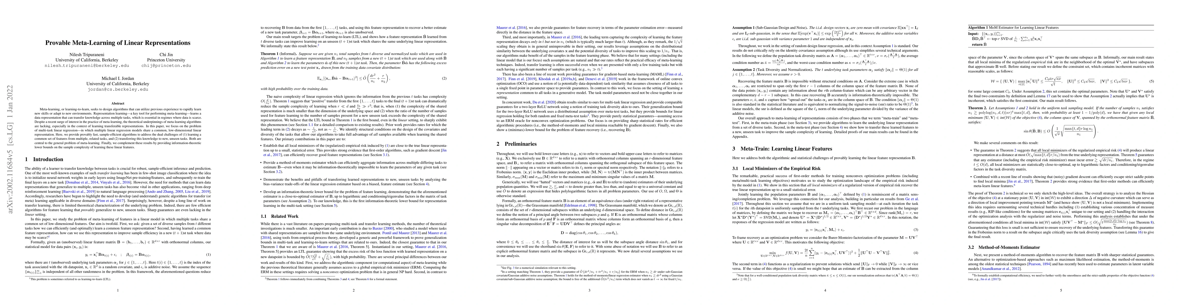 This paper develops provable algorithms for meta-learning linear representations in multi-task linear regression, focusing on efficiently learning shared features across related tasks and transferring this knowledge to new tasks. It also establishes information-theoretic lower bounds on the sample complexity required for such learning.