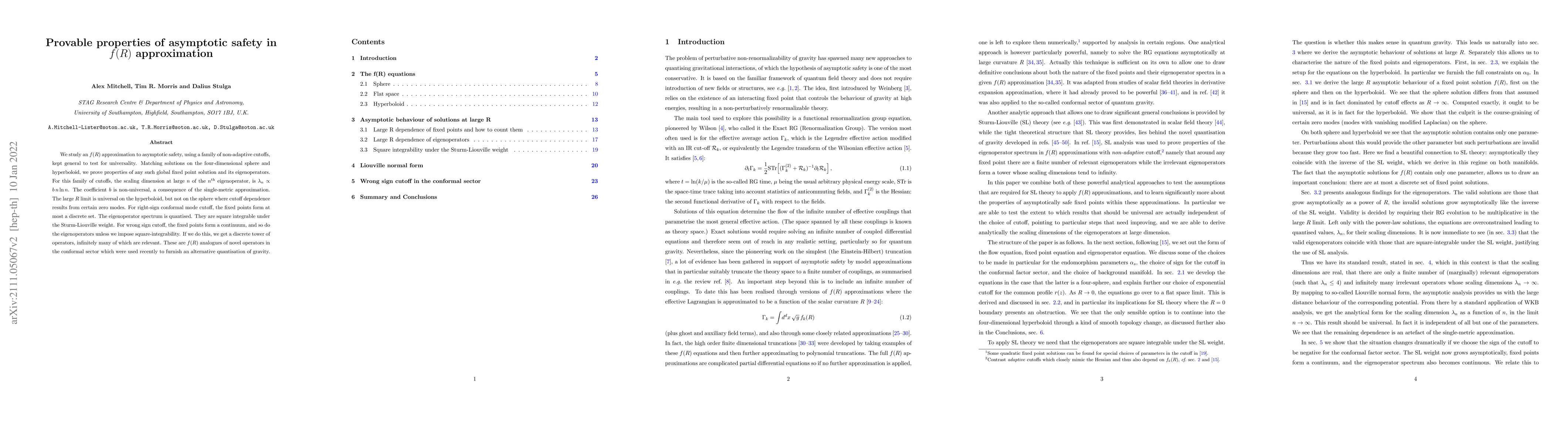 We study an $f(R)$ approximation to asymptotic safety, using a family of non-adaptive cutoffs, kept general to test for universality. Matching solutions on the four-dimensional sphere and hyperboloid, we prove properties of any such global fixed point solution and its eigenoperators. For this family of cutoffs, the scaling dimension at large $n$ of the $n^\text{th}$ eigenoperator, is $\lambda_n\propto b\, n\ln n$. The coefficient $b$ is non-universal, a consequence of the single-metric approximation. The large $R$ limit is universal on the hyperboloid, but not on the sphere where cutoff dependence results from certain zero modes. For right-sign conformal mode cutoff, the fixed points form at most a discrete set. The eigenoperator spectrum is quantised. They are square integrable under the Sturm-Liouville weight. For wrong sign cutoff, the fixed points form a continuum, and so do the eigenoperators unless we impose square-integrability. If we do this, we get a discrete tower of operators, infinitely many of which are relevant. These are $f(R)$ analogues of novel operators in the conformal sector which were used recently to furnish an alternative quantisation of gravity.