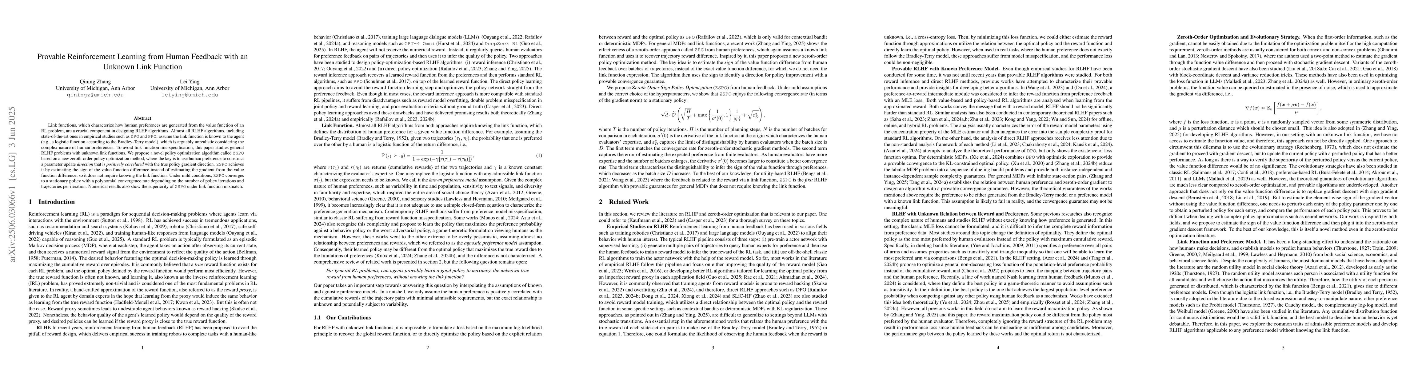 Link functions, which characterize how human preferences are generated from the value function of an RL problem, are a crucial component in designing RLHF algorithms. Almost all RLHF algorithms, including state-of-the-art ones in empirical studies such as DPO and PPO, assume the link function is known to the agent (e.g., a logistic function according to the Bradley-Terry model), which is arguably unrealistic considering the complex nature of human preferences. To avoid link function mis-specification, this paper studies general RLHF problems with unknown link functions. We propose a novel policy optimization algorithm called ZSPO based on a new zeroth-order policy optimization method, where the key is to use human preference to construct a parameter update direction that is positively correlated with the true policy gradient direction. ZSPO achieves it by estimating the sign of the value function difference instead of estimating the gradient from the value function difference, so it does not require knowing the link function. Under mild conditions, ZSPO converges to a stationary policy with a polynomial convergence rate depending on the number of policy iterations and trajectories per iteration. Numerical results also show the superiority of ZSPO under link function mismatch.