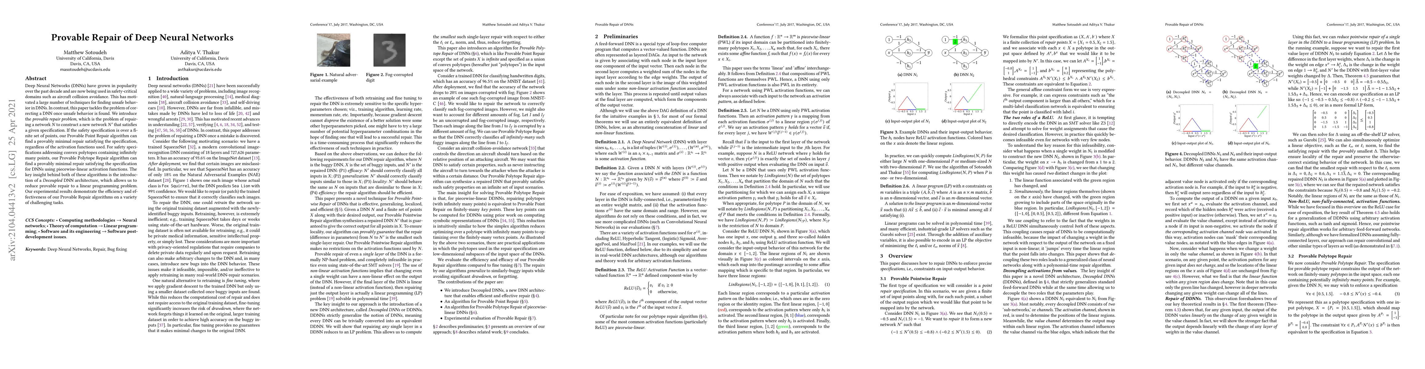 This paper introduces algorithms for provably repairing deep neural networks (DNNs) to correct unsafe behavior, focusing on minimal modifications that satisfy safety specifications. The Provable Point Repair and Provable Polytope Repair algorithms leverage a Decoupled DNN architecture to reduce the repair problem to linear programming, demonstrating efficiency and effectiveness across various tasks.