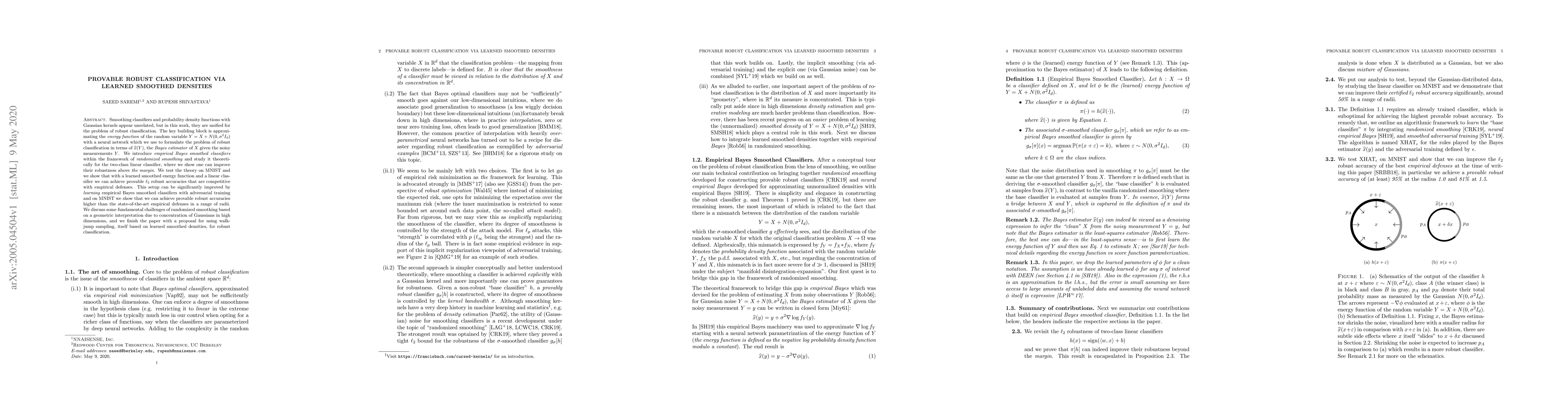 This paper unifies Gaussian kernel smoothing of classifiers and density functions to enhance robust classification. It introduces empirical Bayes smoothed classifiers within randomized smoothing to achieve provably robust accuracy, especially for linear classifiers on MNIST, and shows improvements through adversarial training. It also proposes walk-jump sampling for further robustness.