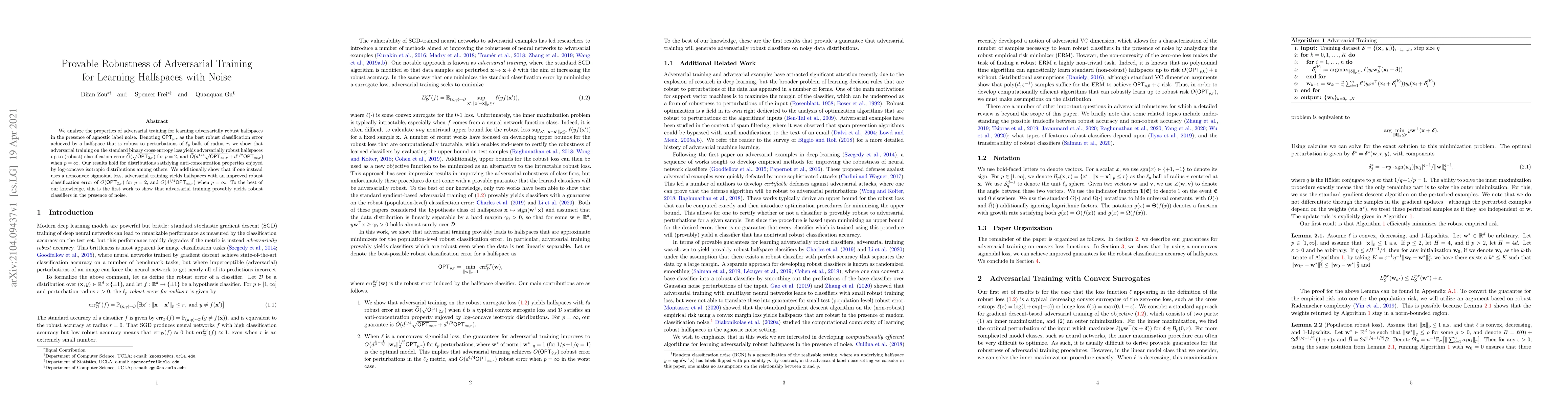 This paper analyzes adversarial training for learning robust halfspaces in the presence of label noise, demonstrating that it achieves provable robustness. For binary cross-entropy loss, the method yields robust halfspaces with error bounds $\tilde O(\sqrt{\mathsf{OPT}_{2,r}})$ for $p=2$ and $\tilde O(d^{1/4}\sqrt{\mathsf{OPT}_{\infty, r}} + d^{1/2}\mathsf{OPT}_{\infty,r})$ for $p=\infty$. Using a nonconvex sigmoidal loss improves the error bounds to $O(\mathsf{OPT}_{2,r})$ and $O(d^{1/4}\mathsf{OPT}_{\infty, r})$.