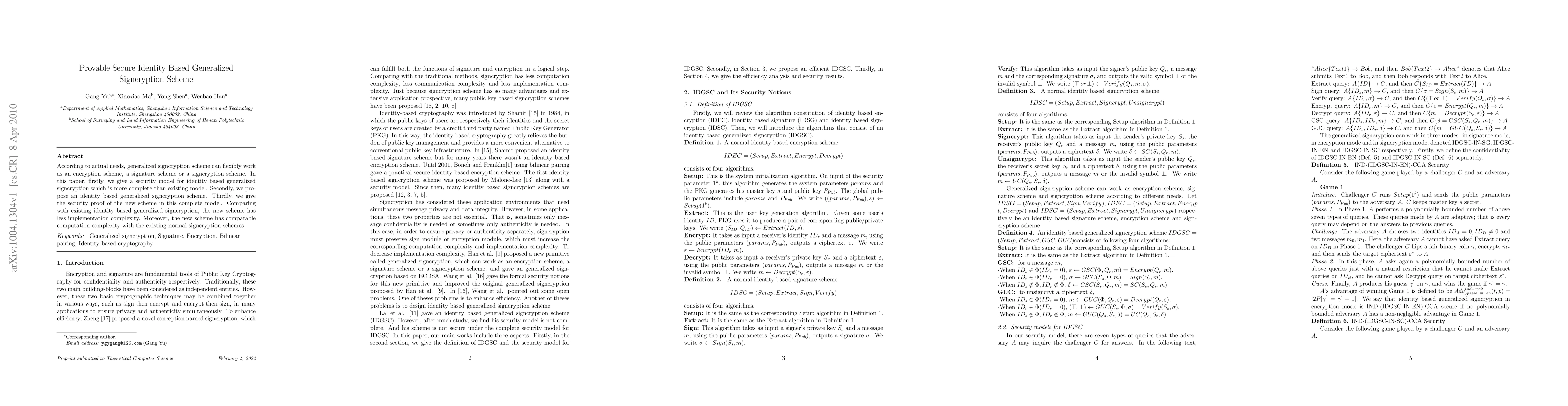 This paper introduces a more comprehensive security model for identity-based generalized signcryption and proposes a new scheme that can flexibly function as encryption, signature, or signcryption. The new scheme demonstrates reduced implementation complexity and comparable computation efficiency to standard signcryption schemes.