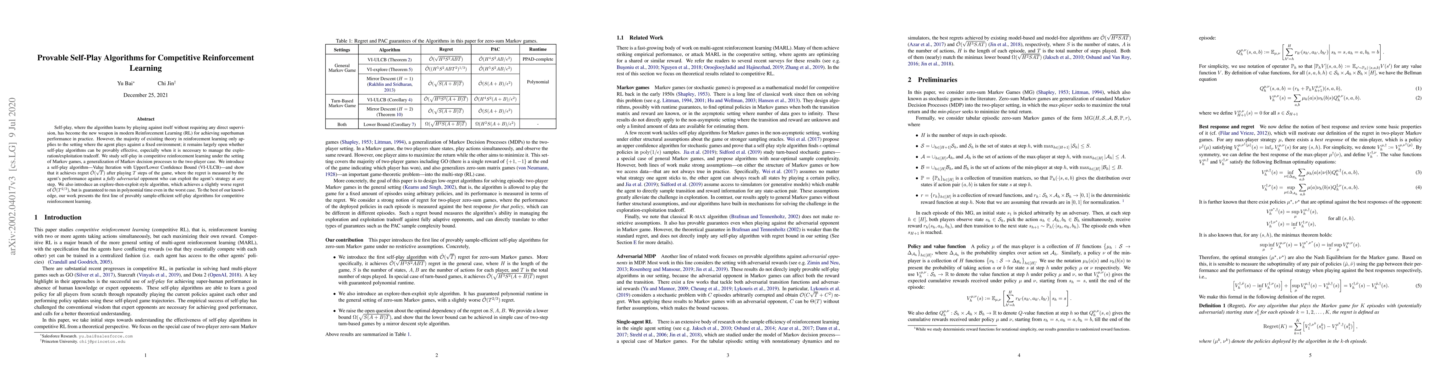 This paper introduces self-play algorithms for competitive reinforcement learning in Markov games, proving their effectiveness through regret analysis. The proposed VI-ULCB algorithm achieves $\tilde{\mathcal{O}}(\sqrt{T})$ regret, while an explore-then-exploit variant offers polynomial time guarantees at the cost of $\tilde{\mathcal{O}}(T^{2/3})$ regret.