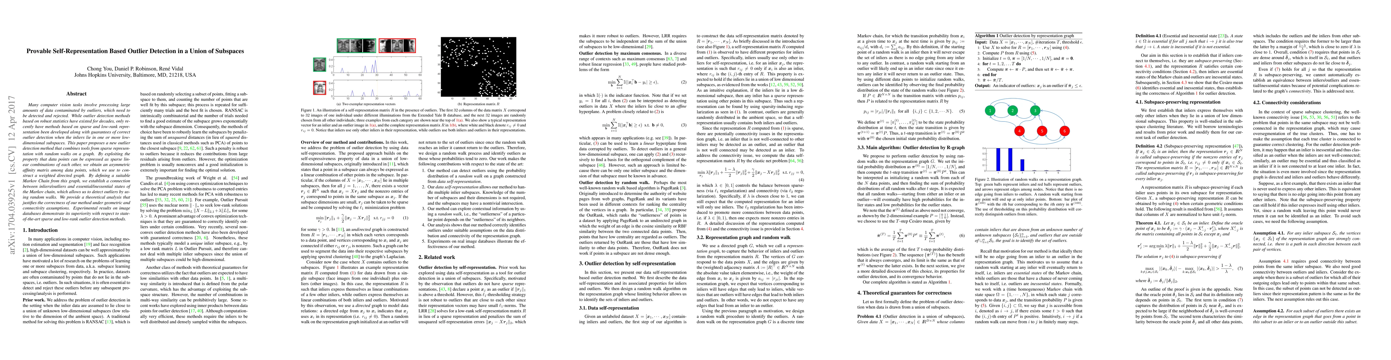 Many computer vision tasks involve processing large amounts of data contaminated by outliers, which need to be detected and rejected. While outlier detection methods based on robust statistics have existed for decades, only recently have methods based on sparse and low-rank representation been developed along with guarantees of correct outlier detection when the inliers lie in one or more low-dimensional subspaces. This paper proposes a new outlier detection method that combines tools from sparse representation with random walks on a graph. By exploiting the property that data points can be expressed as sparse linear combinations of each other, we obtain an asymmetric affinity matrix among data points, which we use to construct a weighted directed graph. By defining a suitable Markov Chain from this graph, we establish a connection between inliers/outliers and essential/inessential states of the Markov chain, which allows us to detect outliers by using random walks. We provide a theoretical analysis that justifies the correctness of our method under geometric and connectivity assumptions. Experimental results on image databases demonstrate its superiority with respect to state-of-the-art sparse and low-rank outlier detection methods.