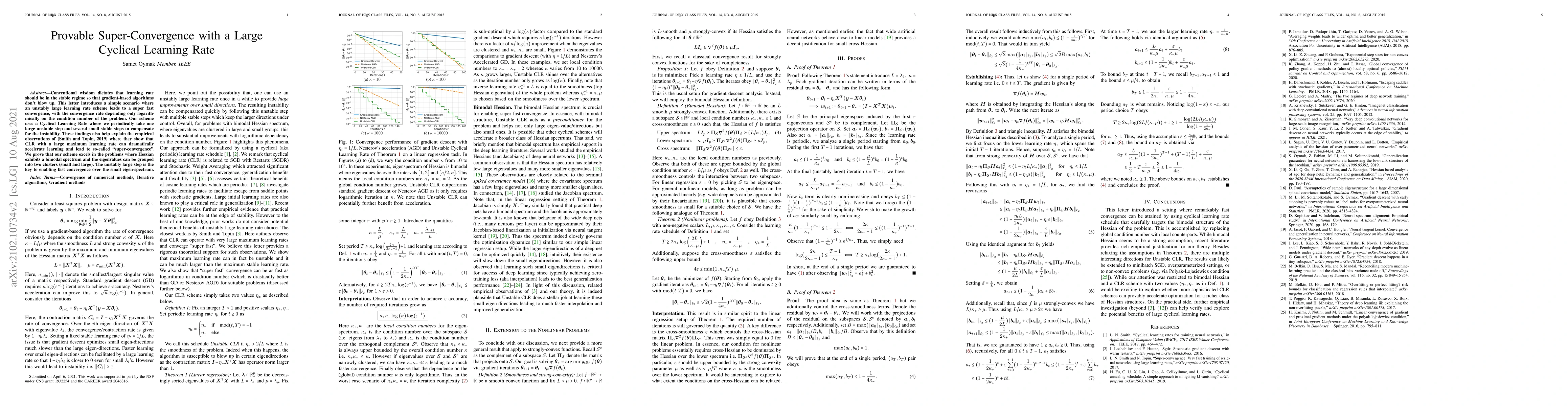 This paper proposes a Cyclical Learning Rate (CLR) strategy using large, unstable steps that leads to super-fast convergence, with a convergence rate dependent logarithmically on the problem's condition number. The method compensates for instability through small, stable steps, achieving "super-convergence" in problems with bimodal Hessian spectra.