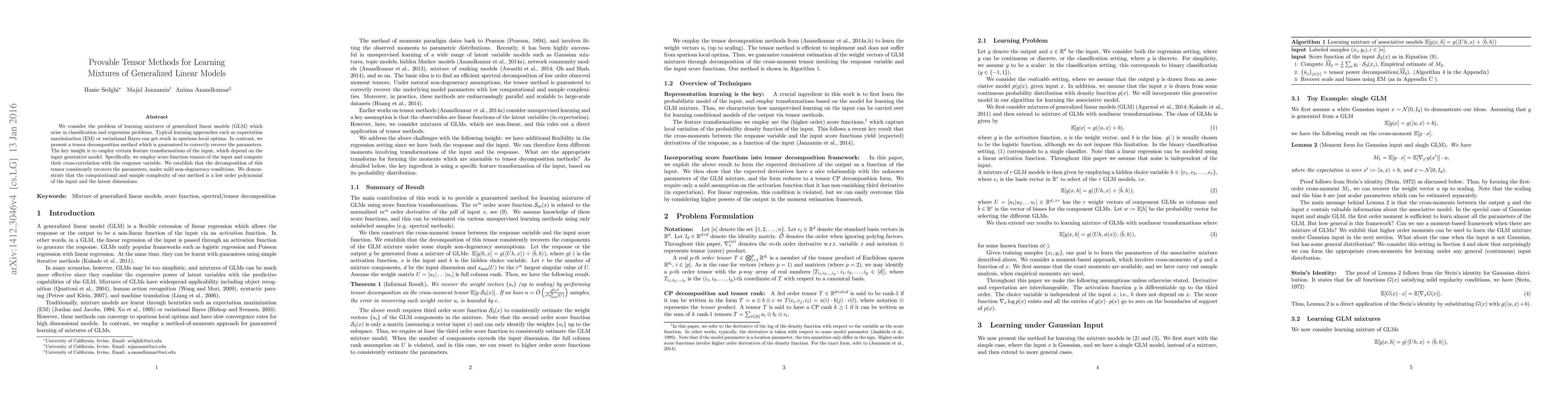 This paper proposes a tensor decomposition method for learning mixtures of generalized linear models, ensuring parameter recovery through score function tensors and their cross-correlation with response variables. This approach avoids local optima issues and has polynomial computational and sample complexity.