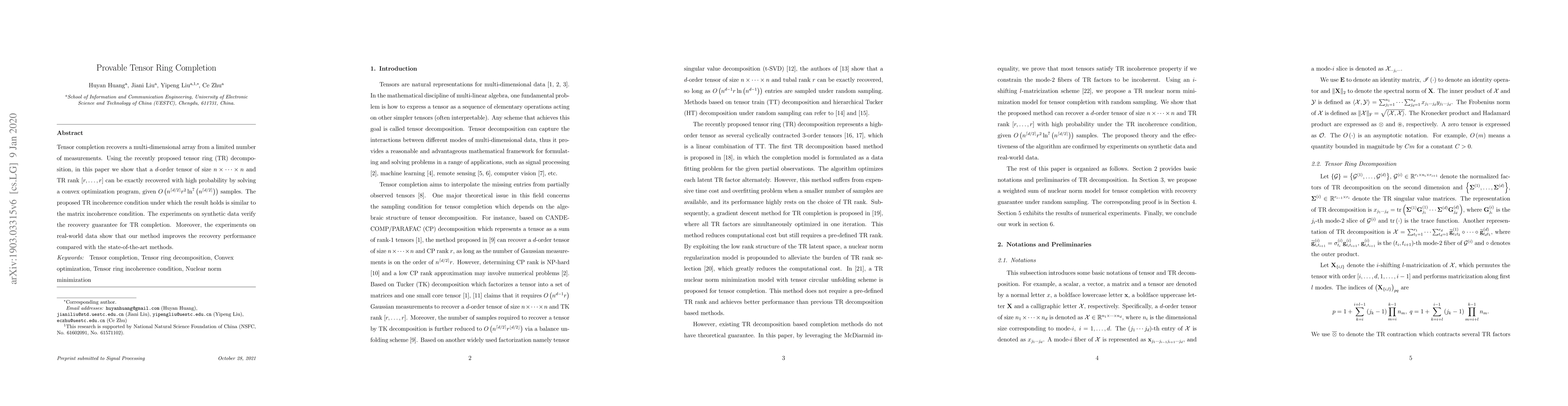 This paper presents a method for tensor completion using tensor ring decomposition, demonstrating that a d-order tensor can be accurately recovered from a limited number of measurements via a convex optimization program, provided sufficient samples. Experiments show improved recovery performance over existing methods on both synthetic and real-world datasets.