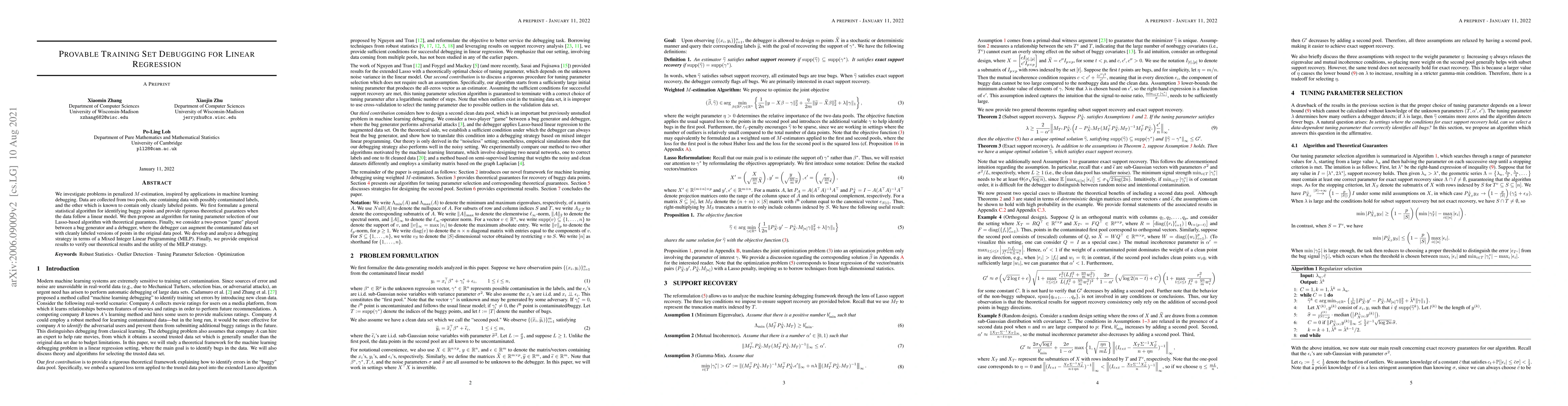 We investigate problems in penalized $M$-estimation, inspired by applications in machine learning debugging. Data are collected from two pools, one containing data with possibly contaminated labels, and the other which is known to contain only cleanly labeled points. We first formulate a general statistical algorithm for identifying buggy points and provide rigorous theoretical guarantees under the assumption that the data follow a linear model. We then present two case studies to illustrate the results of our general theory and the dependence of our estimator on clean versus buggy points. We further propose an algorithm for tuning parameter selection of our Lasso-based algorithm and provide corresponding theoretical guarantees. Finally, we consider a two-person "game" played between a bug generator and a debugger, where the debugger can augment the contaminated data set with cleanly labeled versions of points in the original data pool. We establish a theoretical result showing a sufficient condition under which the bug generator can always fool the debugger. Nonetheless, we provide empirical results showing that such a situation may not occur in practice, making it possible for natural augmentation strategies combined with our Lasso debugging algorithm to succeed.