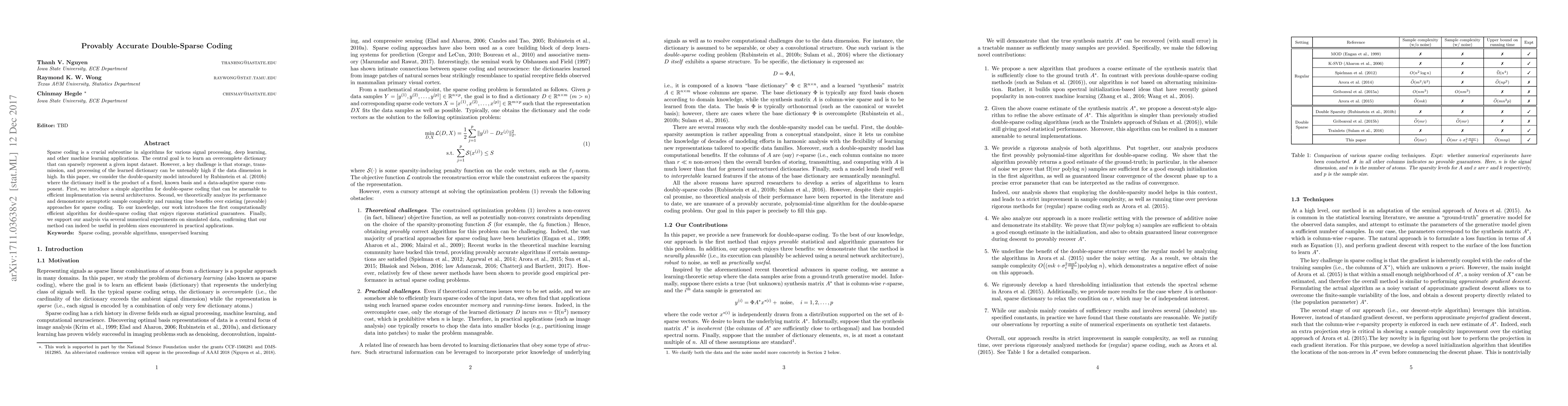 Sparse coding is a crucial subroutine in algorithms for various signal processing, deep learning, and other machine learning applications. The central goal is to learn an overcomplete dictionary that can sparsely represent a given input dataset. However, a key challenge is that storage, transmission, and processing of the learned dictionary can be untenably high if the data dimension is high. In this paper, we consider the double-sparsity model introduced by Rubinstein et al. (2010b) where the dictionary itself is the product of a fixed, known basis and a data-adaptive sparse component. First, we introduce a simple algorithm for double-sparse coding that can be amenable to efficient implementation via neural architectures. Second, we theoretically analyze its performance and demonstrate asymptotic sample complexity and running time benefits over existing (provable) approaches for sparse coding. To our knowledge, our work introduces the first computationally efficient algorithm for double-sparse coding that enjoys rigorous statistical guarantees. Finally, we support our analysis via several numerical experiments on simulated data, confirming that our method can indeed be useful in problem sizes encountered in practical applications.