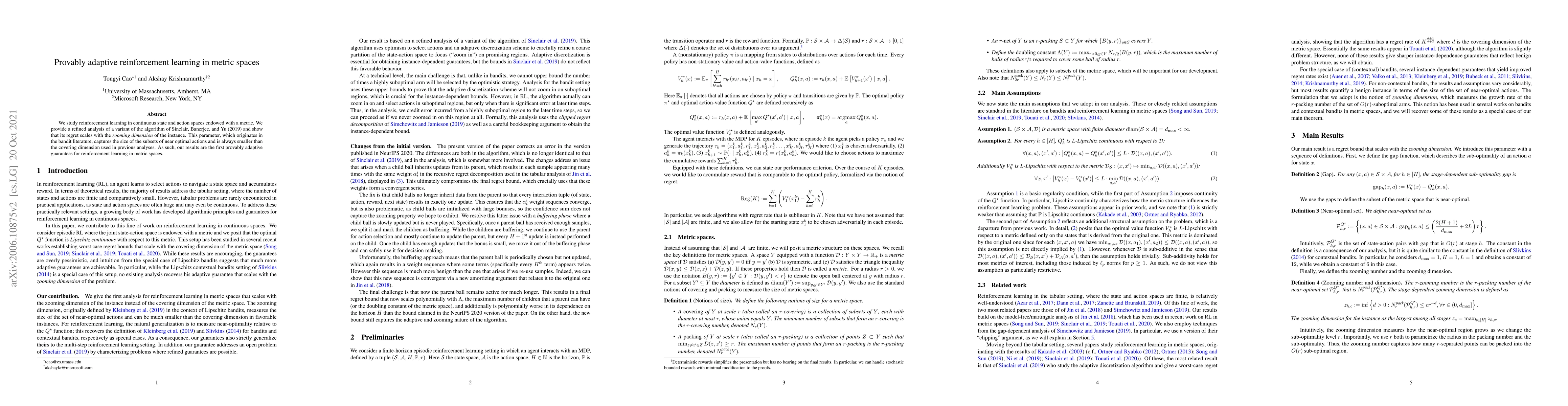 This paper refines an adaptive reinforcement learning algorithm for continuous state and action spaces, demonstrating that its regret scales with the zooming dimension, a more precise metric than previous covering dimension analyses, providing the first provably adaptive guarantees in metric reinforcement learning.