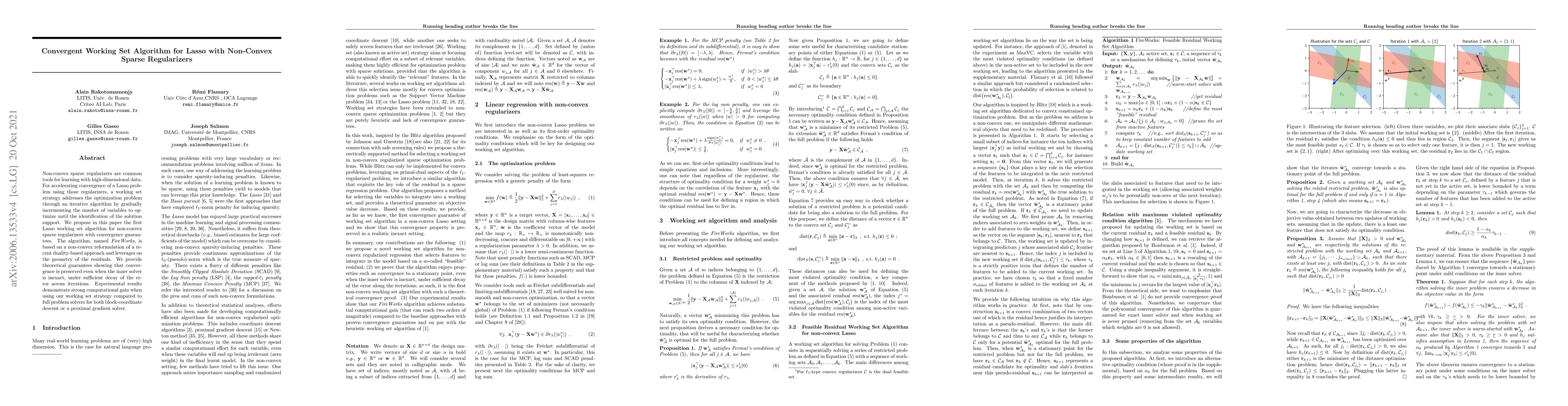 Owing to their statistical properties, non-convex sparse regularizers have attracted much interest for estimating a sparse linear model from high dimensional data. Given that the solution is sparse, for accelerating convergence, a working set strategy addresses the optimization problem through an iterative algorithm by incre-menting the number of variables to optimize until the identification of the solution support. While those methods have been well-studied and theoretically supported for convex regularizers, this paper proposes a working set algorithm for non-convex sparse regularizers with convergence guarantees. The algorithm, named FireWorks, is based on a non-convex reformulation of a recent primal-dual approach and leverages on the geometry of the residuals. Our theoretical guarantees derive from a lower bound of the objective function decrease between two inner solver iterations and shows the convergence to a stationary point of the full problem. More importantly, we also show that convergence is preserved even when the inner solver is inexact, under sufficient decay of the error across iterations. Our experimental results demonstrate high computational gain when using our working set strategy compared to the full problem solver for both block-coordinate descent or a proximal gradient solver.