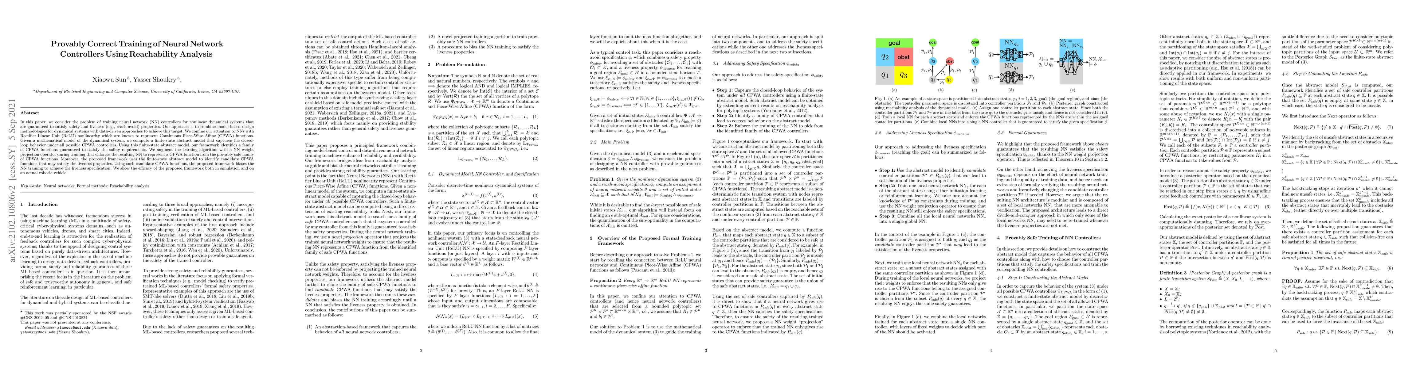 In this paper, we consider the problem of training neural network (NN) controllers for nonlinear dynamical systems that are guaranteed to satisfy safety and liveness (e.g., reach-avoid) properties. Our approach is to combine model-based design methodologies for dynamical systems with data-driven approaches to achieve this target. We confine our attention to NNs with Rectifier Linear Unit (ReLU) nonlinearity which are known to represent Continuous Piece-Wise Affine (CPWA) functions. Given a mathematical model of the dynamical system, we compute a finite-state abstract model that captures the closed-loop behavior under all possible CPWA controllers. Using this finite-state abstract model, our framework identifies a family of CPWA functions guaranteed to satisfy the safety requirements. We augment the learning algorithm with a NN weight projection operator during training that enforces the resulting NN to represent a CPWA function from the provably safe family of CPWA functions. Moreover, the proposed framework uses the finite-state abstract model to identify candidate CPWA functions that may satisfy the liveness properties. Using such candidate CPWA functions, the proposed framework biases the NN training to achieve the liveness specification. We show the efficacy of the proposed framework both in simulation and on an actual robotic vehicle.