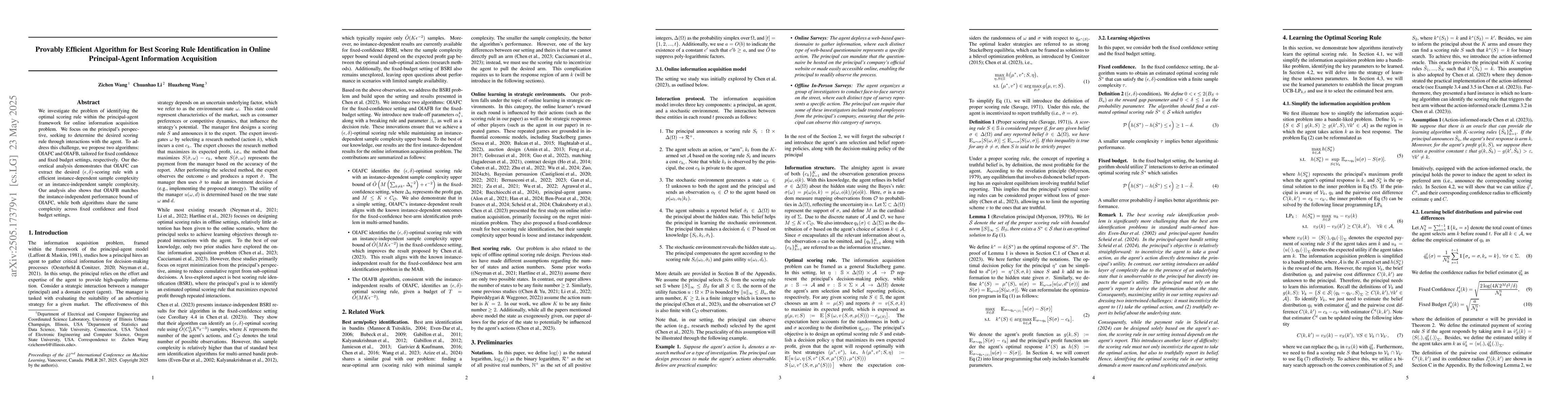 We investigate the problem of identifying the optimal scoring rule within the principal-agent framework for online information acquisition problem. We focus on the principal's perspective, seeking to determine the desired scoring rule through interactions with the agent. To address this challenge, we propose two algorithms: OIAFC and OIAFB, tailored for fixed confidence and fixed budget settings, respectively. Our theoretical analysis demonstrates that OIAFC can extract the desired $(\epsilon, \delta)$-scoring rule with a efficient instance-dependent sample complexity or an instance-independent sample complexity. Our analysis also shows that OIAFB matches the instance-independent performance bound of OIAFC, while both algorithms share the same complexity across fixed confidence and fixed budget settings.