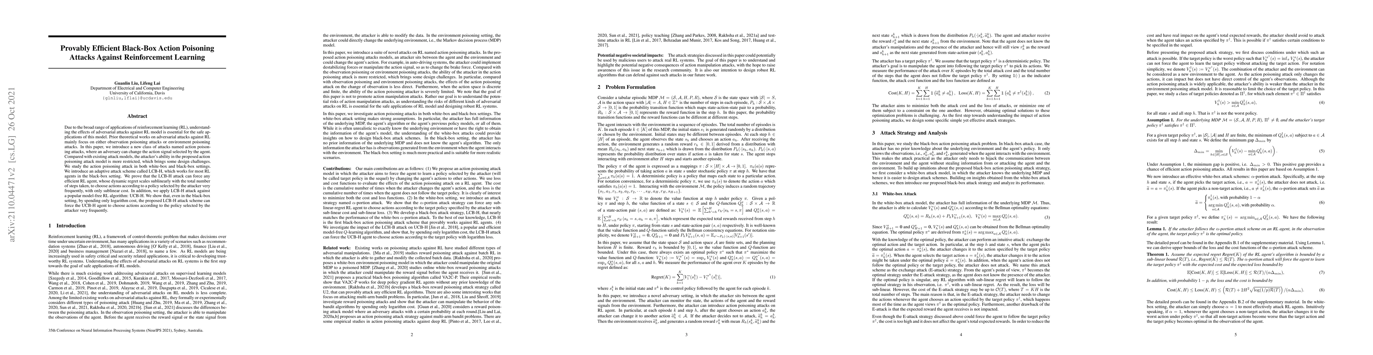 This paper introduces a novel black-box action poisoning attack against reinforcement learning (RL) models, demonstrating that the LCB-H attack can compel efficient RL agents to follow an attacker-defined policy with minimal cost, even in a black-box setting. The study proves the effectiveness of LCB-H against a popular RL algorithm, UCB-H, highlighting the vulnerability of RL systems to such attacks.