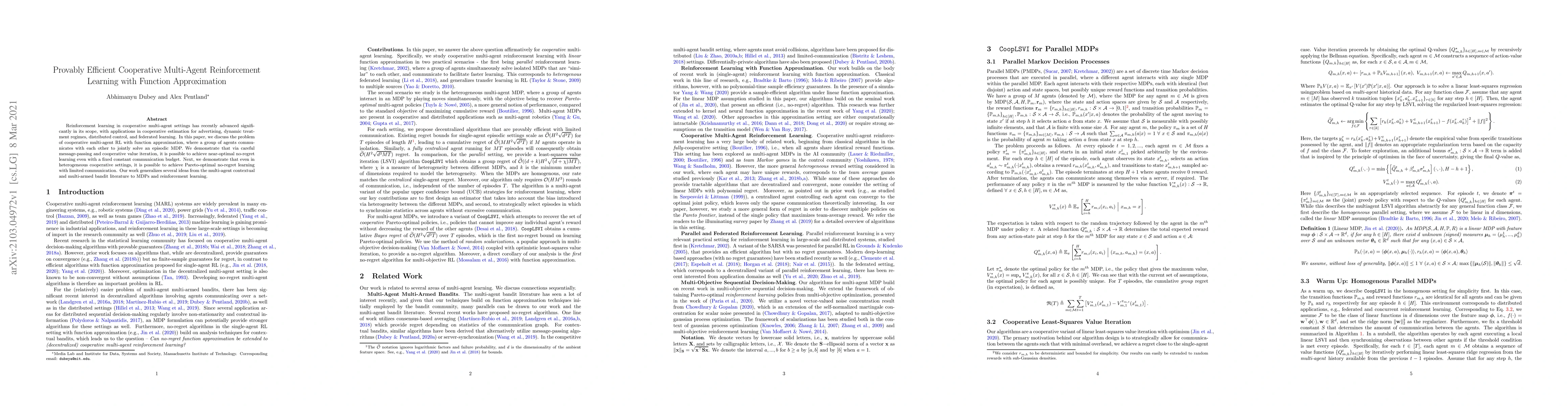 This paper explores cooperative multi-agent reinforcement learning with function approximation, demonstrating near-optimal no-regret learning through message-passing and cooperative value iteration under a fixed communication budget. It also extends these findings to heterogeneous settings, achieving Pareto-optimal no-regret learning with limited communication.