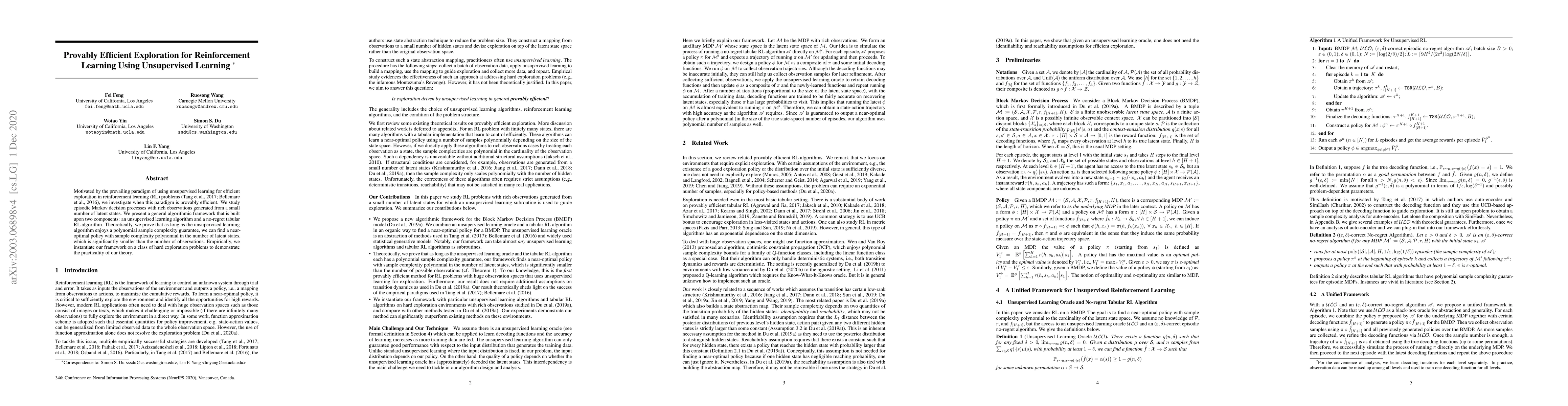 This paper develops a provably efficient exploration framework for reinforcement learning using unsupervised learning, proving that under certain conditions, it can find near-optimal policies with a sample complexity significantly lower than traditional methods. The framework combines unsupervised learning and no-regret tabular RL algorithms, validated through empirical tests on hard exploration problems.