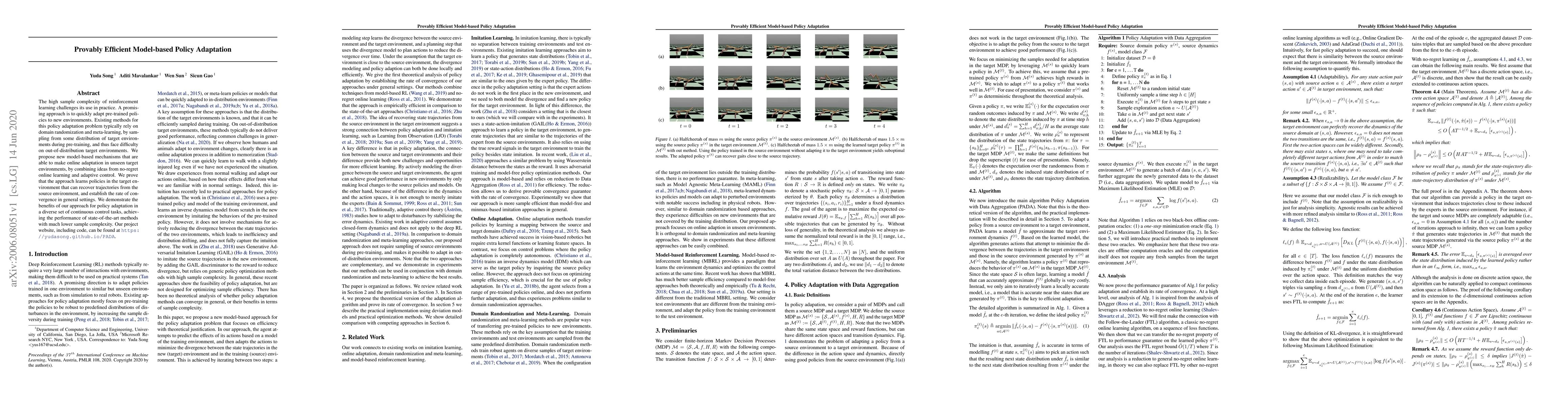 The high sample complexity of reinforcement learning challenges its use in practice. A promising approach is to quickly adapt pre-trained policies to new environments. Existing methods for this policy adaptation problem typically rely on domain randomization and meta-learning, by sampling from some distribution of target environments during pre-training, and thus face difficulty on out-of-distribution target environments. We propose new model-based mechanisms that are able to make online adaptation in unseen target environments, by combining ideas from no-regret online learning and adaptive control. We prove that the approach learns policies in the target environment that can quickly recover trajectories from the source environment, and establish the rate of convergence in general settings. We demonstrate the benefits of our approach for policy adaptation in a diverse set of continuous control tasks, achieving the performance of state-of-the-art methods with much lower sample complexity.