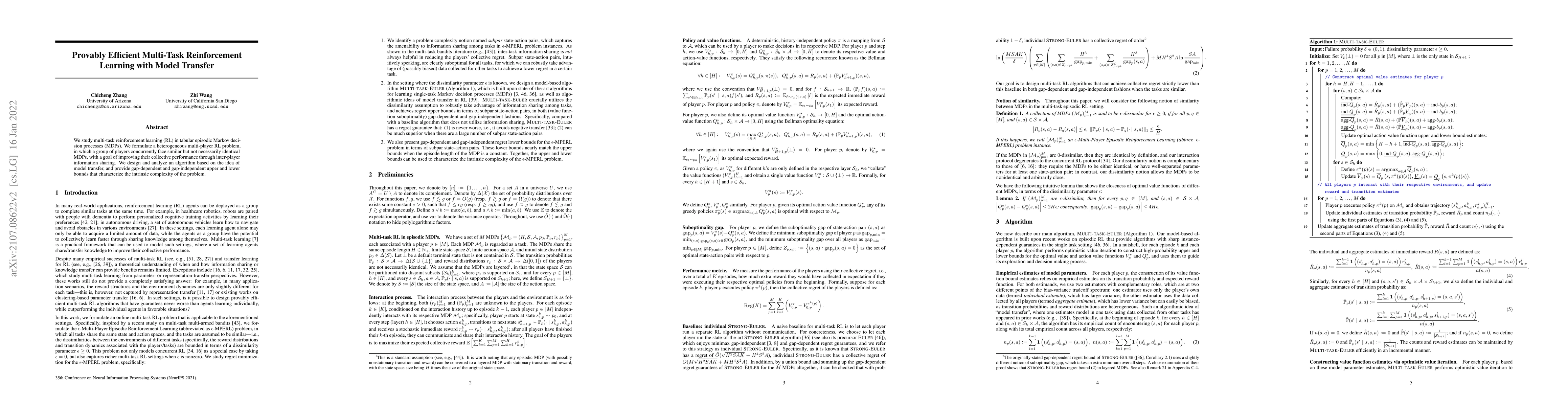 This paper investigates multi-task reinforcement learning in tabular episodic Markov decision processes, proposing an algorithm that leverages model transfer for information sharing among players to enhance collective performance. It provides both gap-dependent and gap-independent bounds to characterize the problem's intrinsic complexity.