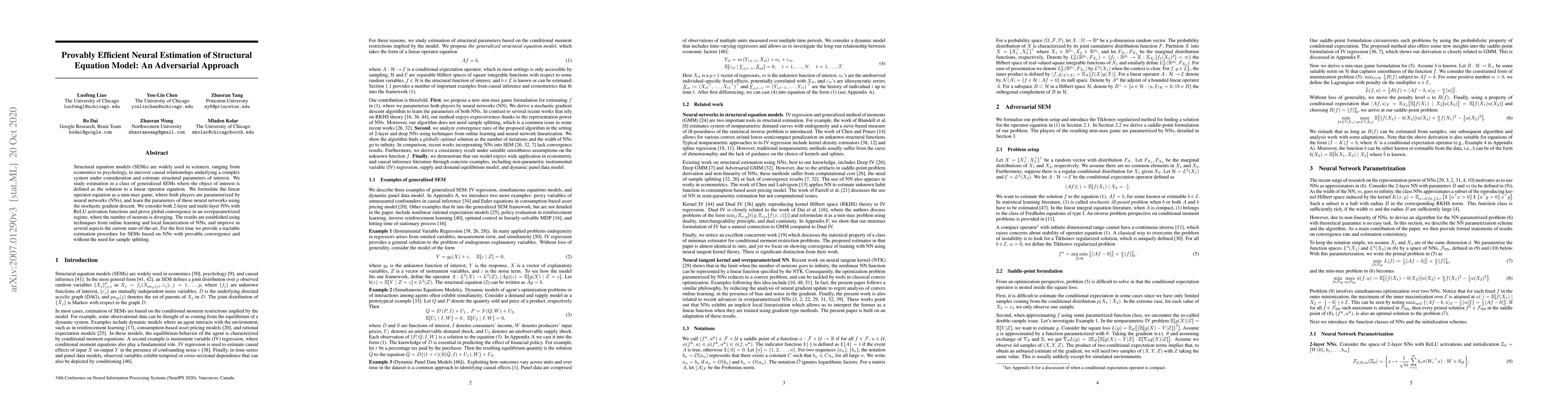 Structural equation models (SEMs) are widely used in sciences, ranging from economics to psychology, to uncover causal relationships underlying a complex system under consideration and estimate structural parameters of interest. We study estimation in a class of generalized SEMs where the object of interest is defined as the solution to a linear operator equation. We formulate the linear operator equation as a min-max game, where both players are parameterized by neural networks (NNs), and learn the parameters of these neural networks using the stochastic gradient descent. We consider both 2-layer and multi-layer NNs with ReLU activation functions and prove global convergence in an overparametrized regime, where the number of neurons is diverging. The results are established using techniques from online learning and local linearization of NNs, and improve in several aspects the current state-of-the-art. For the first time we provide a tractable estimation procedure for SEMs based on NNs with provable convergence and without the need for sample splitting.