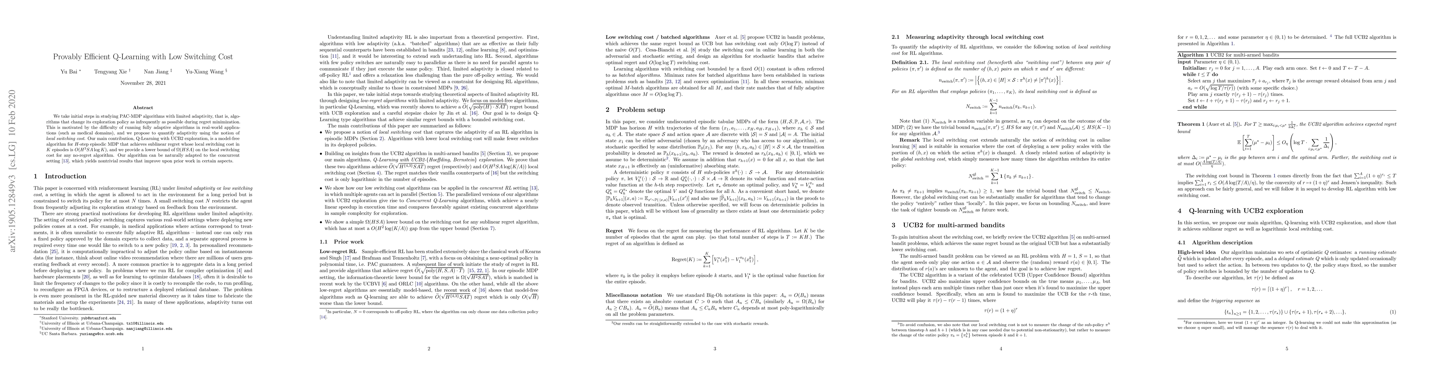 This paper proposes Q-Learning with UCB2 exploration for MDPs, achieving sublinear regret with a low local switching cost of $O(H^3SAarlog K)$. It also provides a lower bound on the switching cost, $arOmega(HSA)$.