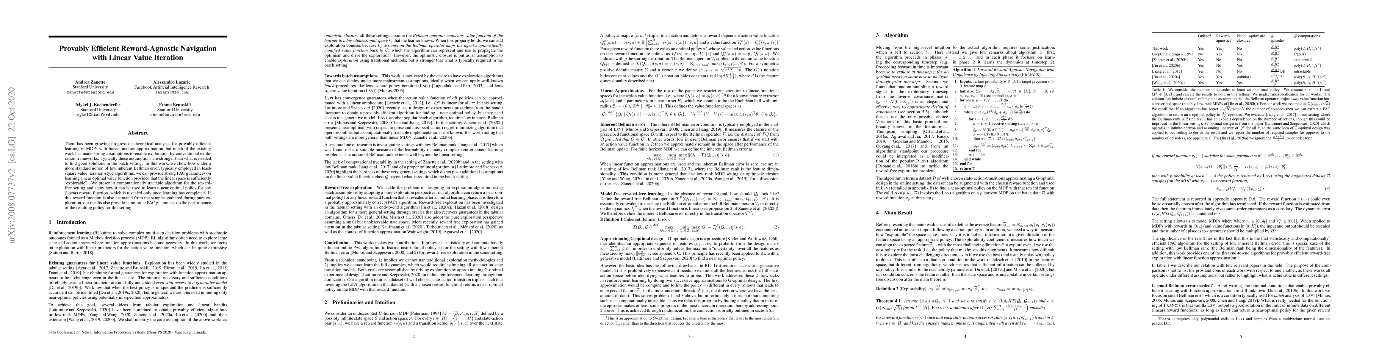 There has been growing progress on theoretical analyses for provably efficient learning in MDPs with linear function approximation, but much of the existing work has made strong assumptions to enable exploration by conventional exploration frameworks. Typically these assumptions are stronger than what is needed to find good solutions in the batch setting. In this work, we show how under a more standard notion of low inherent Bellman error, typically employed in least-square value iteration-style algorithms, we can provide strong PAC guarantees on learning a near optimal value function provided that the linear space is sufficiently "explorable". We present a computationally tractable algorithm for the reward-free setting and show how it can be used to learn a near optimal policy for any (linear) reward function, which is revealed only once learning has completed. If this reward function is also estimated from the samples gathered during pure exploration, our results also provide same-order PAC guarantees on the performance of the resulting policy for this setting.