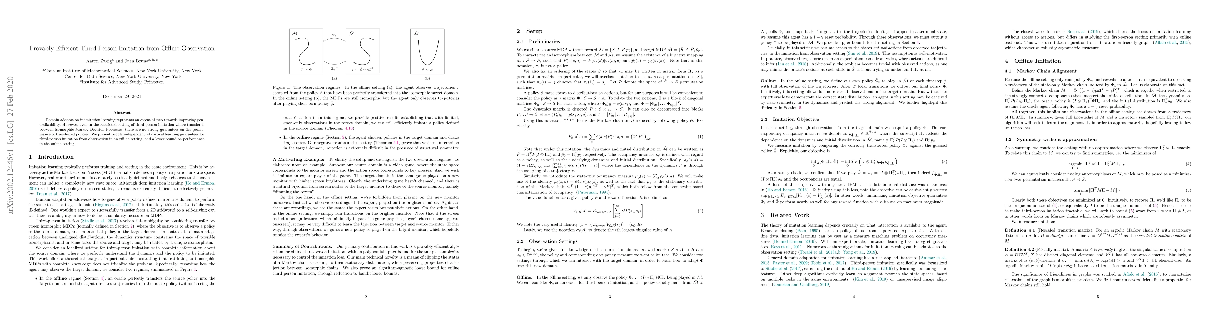 Domain adaptation in imitation learning represents an essential step towards improving generalizability. However, even in the restricted setting of third-person imitation where transfer is between isomorphic Markov Decision Processes, there are no strong guarantees on the performance of transferred policies. We present problem-dependent, statistical learning guarantees for third-person imitation from observation in an offline setting, and a lower bound on performance in the online setting.