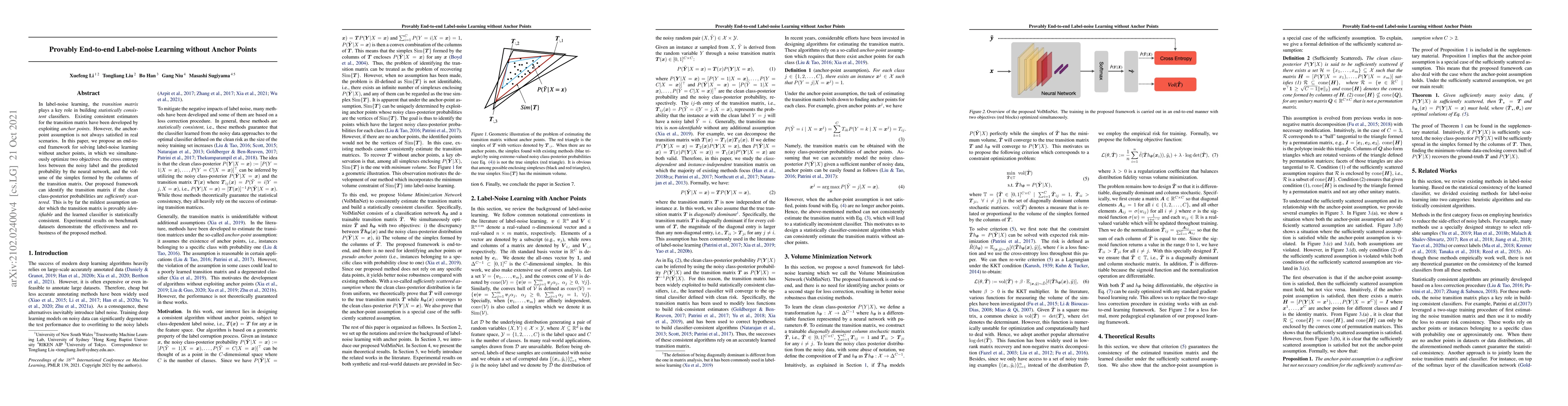 In label-noise learning, the transition matrix plays a key role in building statistically consistent classifiers. Existing consistent estimators for the transition matrix have been developed by exploiting anchor points. However, the anchor-point assumption is not always satisfied in real scenarios. In this paper, we propose an end-to-end framework for solving label-noise learning without anchor points, in which we simultaneously optimize two objectives: the cross entropy loss between the noisy label and the predicted probability by the neural network, and the volume of the simplex formed by the columns of the transition matrix. Our proposed framework can identify the transition matrix if the clean class-posterior probabilities are sufficiently scattered. This is by far the mildest assumption under which the transition matrix is provably identifiable and the learned classifier is statistically consistent. Experimental results on benchmark datasets demonstrate the effectiveness and robustness of the proposed method.