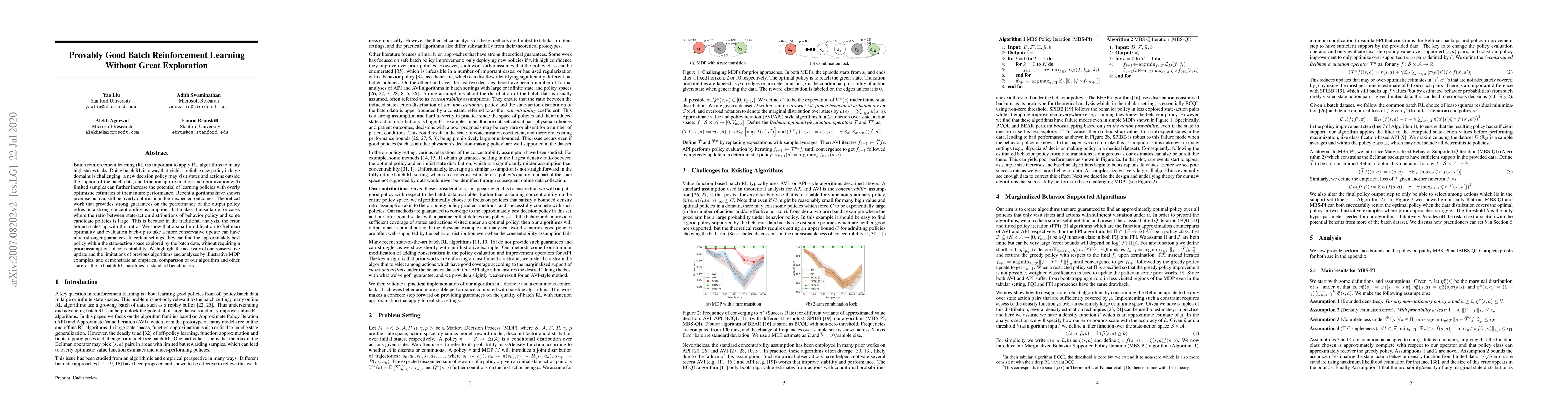 Batch reinforcement learning (RL) is important to apply RL algorithms to many high stakes tasks. Doing batch RL in a way that yields a reliable new policy in large domains is challenging: a new decision policy may visit states and actions outside the support of the batch data, and function approximation and optimization with limited samples can further increase the potential of learning policies with overly optimistic estimates of their future performance. Recent algorithms have shown promise but can still be overly optimistic in their expected outcomes. Theoretical work that provides strong guarantees on the performance of the output policy relies on a strong concentrability assumption, that makes it unsuitable for cases where the ratio between state-action distributions of behavior policy and some candidate policies is large. This is because in the traditional analysis, the error bound scales up with this ratio. We show that a small modification to Bellman optimality and evaluation back-up to take a more conservative update can have much stronger guarantees. In certain settings, they can find the approximately best policy within the state-action space explored by the batch data, without requiring a priori assumptions of concentrability. We highlight the necessity of our conservative update and the limitations of previous algorithms and analyses by illustrative MDP examples, and demonstrate an empirical comparison of our algorithm and other state-of-the-art batch RL baselines in standard benchmarks.
