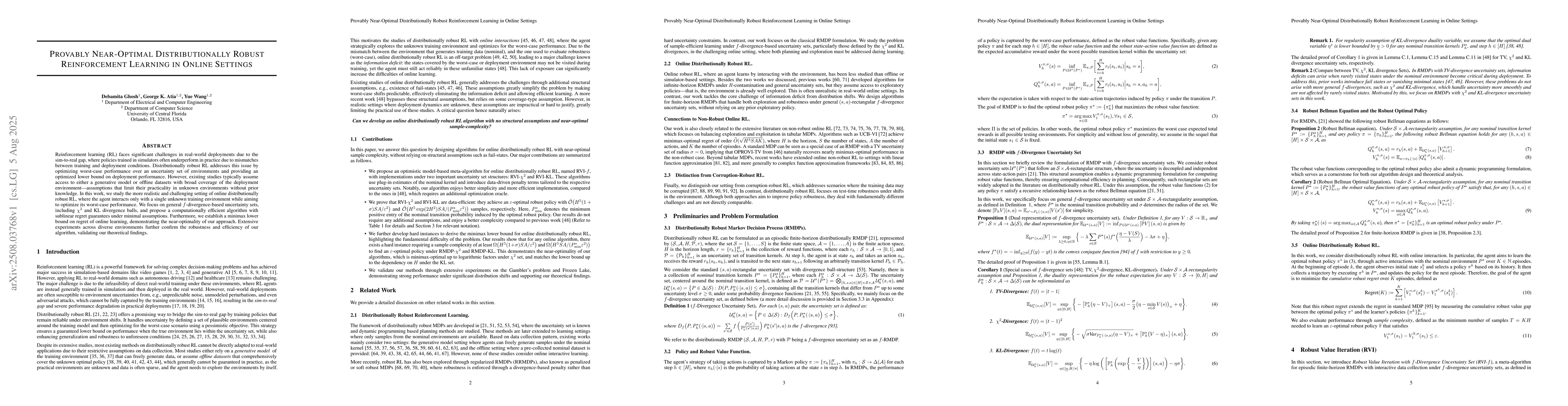 Reinforcement learning (RL) faces significant challenges in real-world deployments due to the sim-to-real gap, where policies trained in simulators often underperform in practice due to mismatches between training and deployment conditions. Distributionally robust RL addresses this issue by optimizing worst-case performance over an uncertainty set of environments and providing an optimized lower bound on deployment performance. However, existing studies typically assume access to either a generative model or offline datasets with broad coverage of the deployment environment -- assumptions that limit their practicality in unknown environments without prior knowledge. In this work, we study the more realistic and challenging setting of online distributionally robust RL, where the agent interacts only with a single unknown training environment while aiming to optimize its worst-case performance. We focus on general $f$-divergence-based uncertainty sets, including Chi-Square and KL divergence balls, and propose a computationally efficient algorithm with sublinear regret guarantees under minimal assumptions. Furthermore, we establish a minimax lower bound on regret of online learning, demonstrating the near-optimality of our approach. Extensive experiments across diverse environments further confirm the robustness and efficiency of our algorithm, validating our theoretical findings.