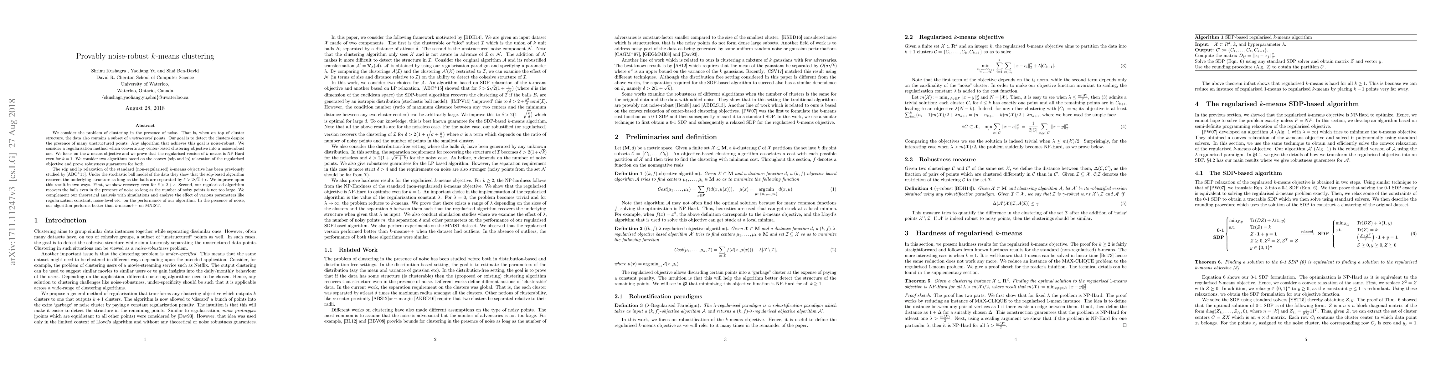 This paper proposes a regularised $k$-means clustering method that enhances noise-robustness, converting the standard $k$-means objective into a noise-tolerant one. The authors prove that the regularised $k$-means is NP-hard even for $k=1$ and introduce two algorithms based on convex relaxations, providing robustness guarantees. They demonstrate improved recovery results under the stochastic ball model and show superior performance over $k$-means++ in noisy conditions on MNIST data.