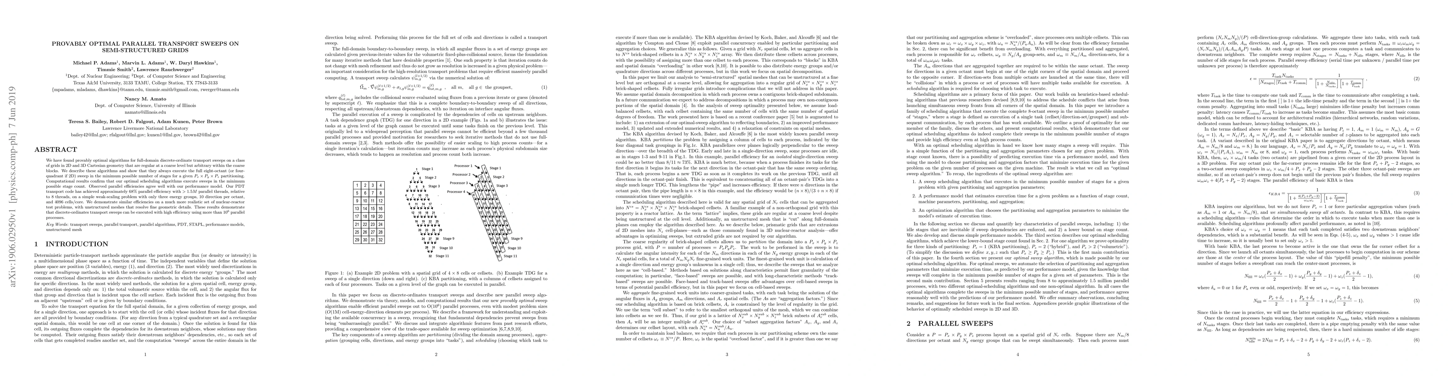 This paper presents provably optimal algorithms for parallel transport sweeps on semi-structured grids, achieving the minimum stage count for full-domain discrete-ordinate transport. The algorithms demonstrate high parallel efficiency, achieving approximately 68% with over 1.5 million parallel threads on both simple and complex nuclear-reactor test problems.