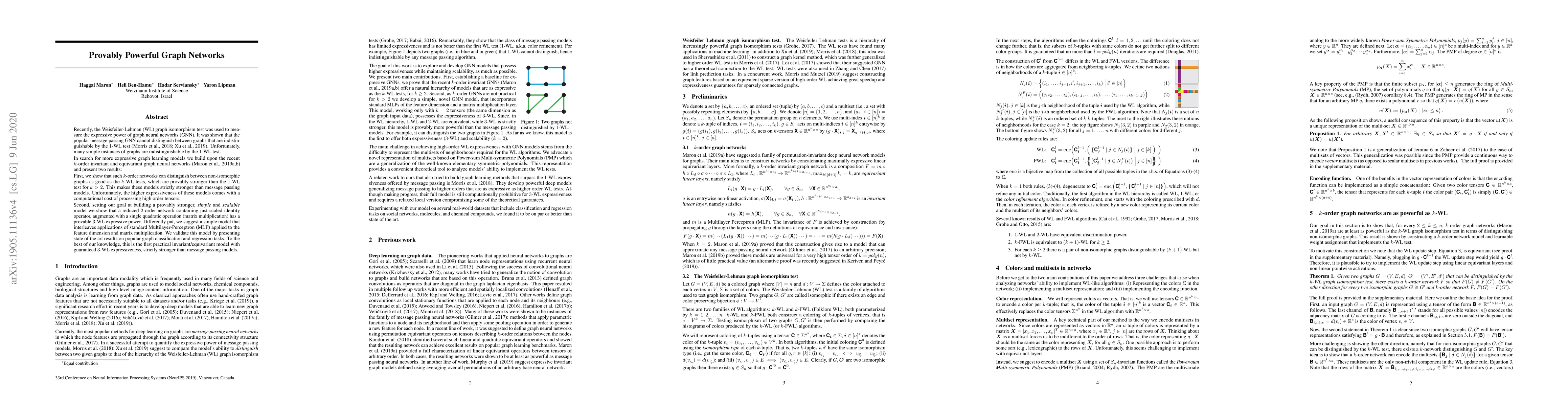 Recently, the Weisfeiler-Lehman (WL) graph isomorphism test was used to measure the expressive power of graph neural networks (GNN). It was shown that the popular message passing GNN cannot distinguish between graphs that are indistinguishable by the 1-WL test (Morris et al. 2018; Xu et al. 2019). Unfortunately, many simple instances of graphs are indistinguishable by the 1-WL test. In search for more expressive graph learning models we build upon the recent k-order invariant and equivariant graph neural networks (Maron et al. 2019a,b) and present two results: First, we show that such k-order networks can distinguish between non-isomorphic graphs as good as the k-WL tests, which are provably stronger than the 1-WL test for k>2. This makes these models strictly stronger than message passing models. Unfortunately, the higher expressiveness of these models comes with a computational cost of processing high order tensors. Second, setting our goal at building a provably stronger, simple and scalable model we show that a reduced 2-order network containing just scaled identity operator, augmented with a single quadratic operation (matrix multiplication) has a provable 3-WL expressive power. Differently put, we suggest a simple model that interleaves applications of standard Multilayer-Perceptron (MLP) applied to the feature dimension and matrix multiplication. We validate this model by presenting state of the art results on popular graph classification and regression tasks. To the best of our knowledge, this is the first practical invariant/equivariant model with guaranteed 3-WL expressiveness, strictly stronger than message passing models.