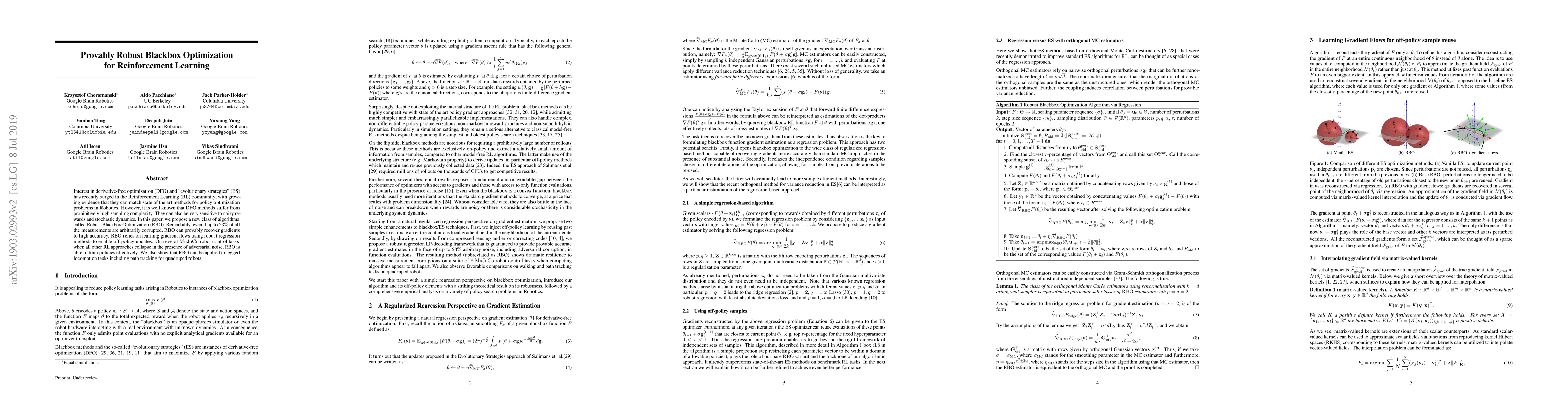 Interest in derivative-free optimization (DFO) and "evolutionary strategies" (ES) has recently surged in the Reinforcement Learning (RL) community, with growing evidence that they can match state of the art methods for policy optimization problems in Robotics. However, it is well known that DFO methods suffer from prohibitively high sampling complexity. They can also be very sensitive to noisy rewards and stochastic dynamics. In this paper, we propose a new class of algorithms, called Robust Blackbox Optimization (RBO). Remarkably, even if up to $23\%$ of all the measurements are arbitrarily corrupted, RBO can provably recover gradients to high accuracy. RBO relies on learning gradient flows using robust regression methods to enable off-policy updates. On several MuJoCo robot control tasks, when all other RL approaches collapse in the presence of adversarial noise, RBO is able to train policies effectively. We also show that RBO can be applied to legged locomotion tasks including path tracking for quadruped robots.