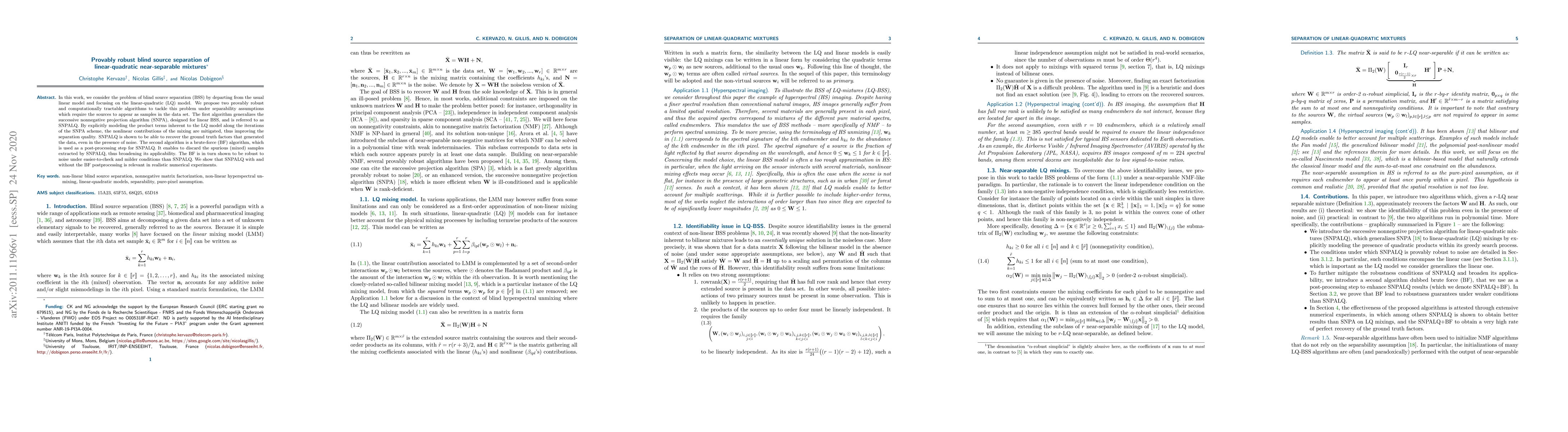 In this work, we consider the problem of blind source separation (BSS) by departing from the usual linear model and focusing on the linear-quadratic (LQ) model. We propose two provably robust and computationally tractable algorithms to tackle this problem under separability assumptions which require the sources to appear as samples in the data set. The first algorithm generalizes the successive nonnegative projection algorithm (SNPA), designed for linear BSS, and is referred to as SNPALQ. By explicitly modeling the product terms inherent to the LQ model along the iterations of the SNPA scheme, the nonlinear contributions of the mixing are mitigated, thus improving the separation quality. SNPALQ is shown to be able to recover the ground truth factors that generated the data, even in the presence of noise. The second algorithm is a brute-force (BF) algorithm, which is used as a post-processing step for SNPALQ. It enables to discard the spurious (mixed) samples extracted by SNPALQ, thus broadening its applicability. The BF is in turn shown to be robust to noise under easier-to-check and milder conditions than SNPALQ. We show that SNPALQ with and without the BF postprocessing is relevant in realistic numerical experiments.
