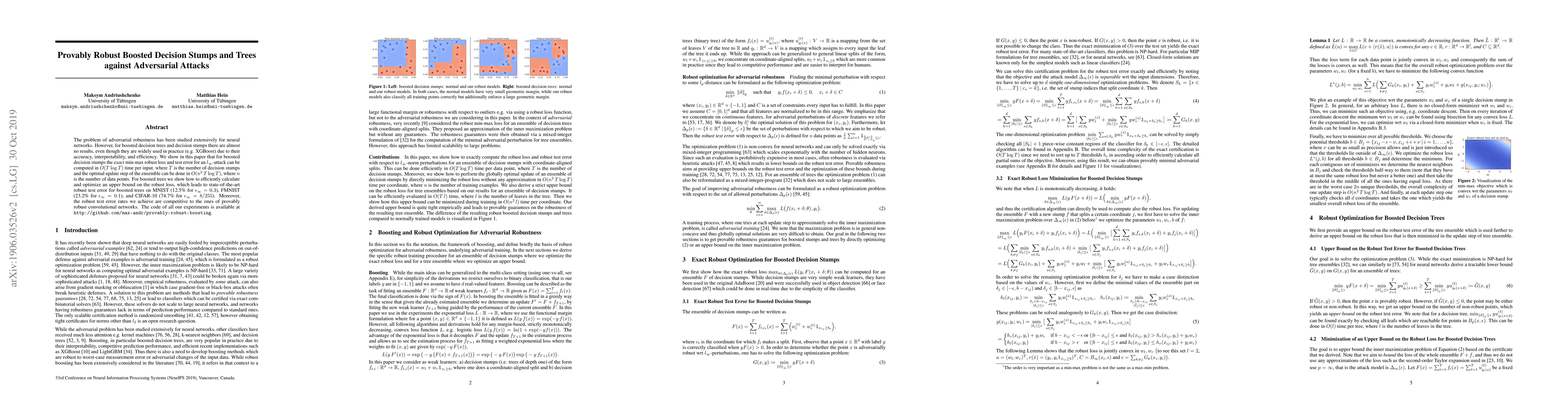 The problem of adversarial robustness has been studied extensively for neural networks. However, for boosted decision trees and decision stumps there are almost no results, even though they are widely used in practice (e.g. XGBoost) due to their accuracy, interpretability, and efficiency. We show in this paper that for boosted decision stumps the \textit{exact} min-max robust loss and test error for an $l_\infty$-attack can be computed in $O(T\log T)$ time per input, where $T$ is the number of decision stumps and the optimal update step of the ensemble can be done in $O(n^2\,T\log T)$, where $n$ is the number of data points. For boosted trees we show how to efficiently calculate and optimize an upper bound on the robust loss, which leads to state-of-the-art robust test error for boosted trees on MNIST (12.5% for $\epsilon_\infty=0.3$), FMNIST (23.2% for $\epsilon_\infty=0.1$), and CIFAR-10 (74.7% for $\epsilon_\infty=8/255$). Moreover, the robust test error rates we achieve are competitive to the ones of provably robust convolutional networks. The code of all our experiments is available at http://github.com/max-andr/provably-robust-boosting