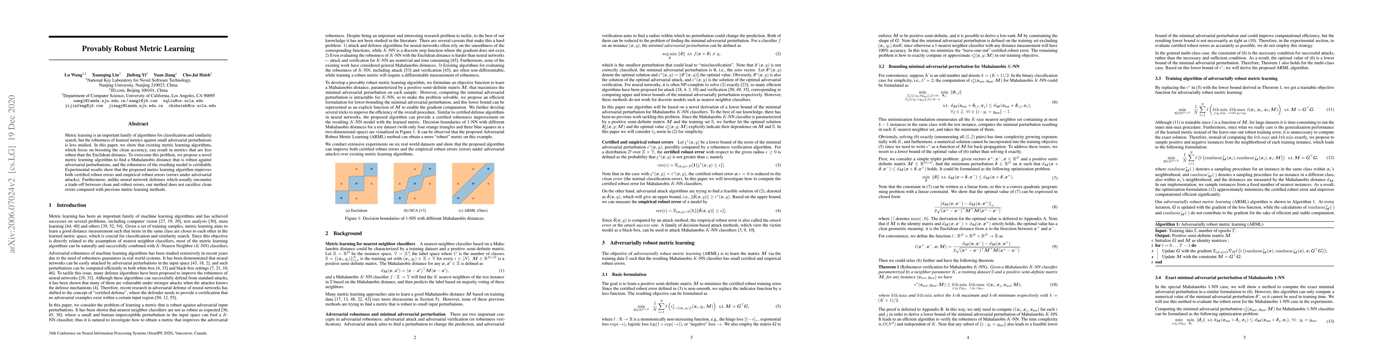 This paper proposes a novel metric learning algorithm to create a robust Mahalanobis distance that is certifiably resistant to adversarial perturbations, improving both certified and empirical robust errors without sacrificing clean accuracy. The method outperforms existing metric learning algorithms in robustness while maintaining clean accuracy.