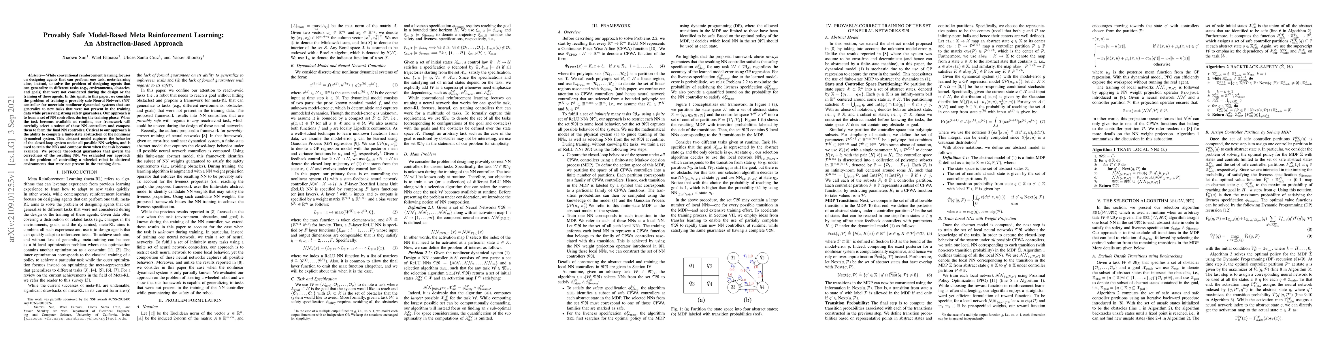 This paper proposes a model-based meta reinforcement learning approach that trains provably safe neural network controllers for uncertain nonlinear dynamical systems. The method uses finite-state abstraction to generalize to new tasks while maintaining safety guarantees, and it was evaluated on a wheeled robot navigating cluttered environments.