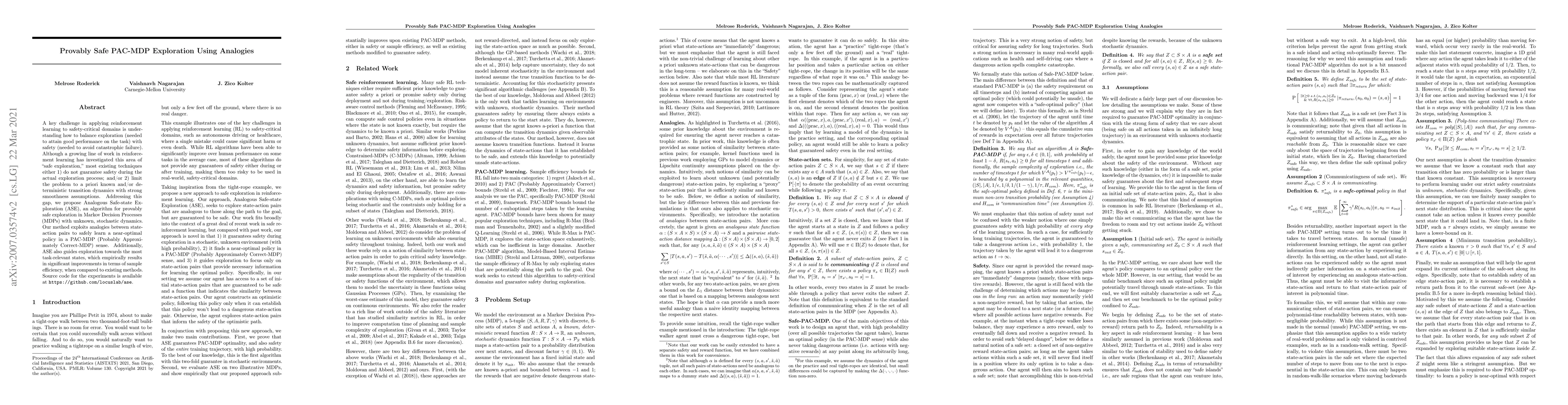 A key challenge in applying reinforcement learning to safety-critical domains is understanding how to balance exploration (needed to attain good performance on the task) with safety (needed to avoid catastrophic failure). Although a growing line of work in reinforcement learning has investigated this area of "safe exploration," most existing techniques either 1) do not guarantee safety during the actual exploration process; and/or 2) limit the problem to a priori known and/or deterministic transition dynamics with strong smoothness assumptions. Addressing this gap, we propose Analogous Safe-state Exploration (ASE), an algorithm for provably safe exploration in MDPs with unknown, stochastic dynamics. Our method exploits analogies between state-action pairs to safely learn a near-optimal policy in a PAC-MDP sense. Additionally, ASE also guides exploration towards the most task-relevant states, which empirically results in significant improvements in terms of sample efficiency, when compared to existing methods.