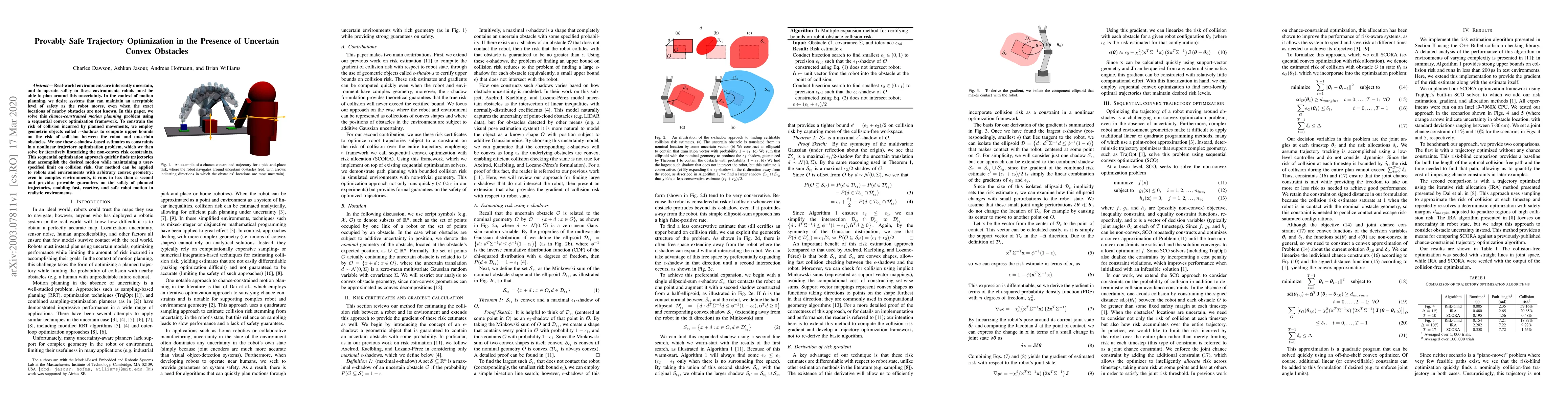 This paper presents a method for safe trajectory optimization in uncertain environments with convex obstacles using a sequential convex optimization framework. It employs $\epsilon$-shadows to estimate collision risks and iteratively linearizes non-convex constraints, ensuring provable safety guarantees in less than a second.