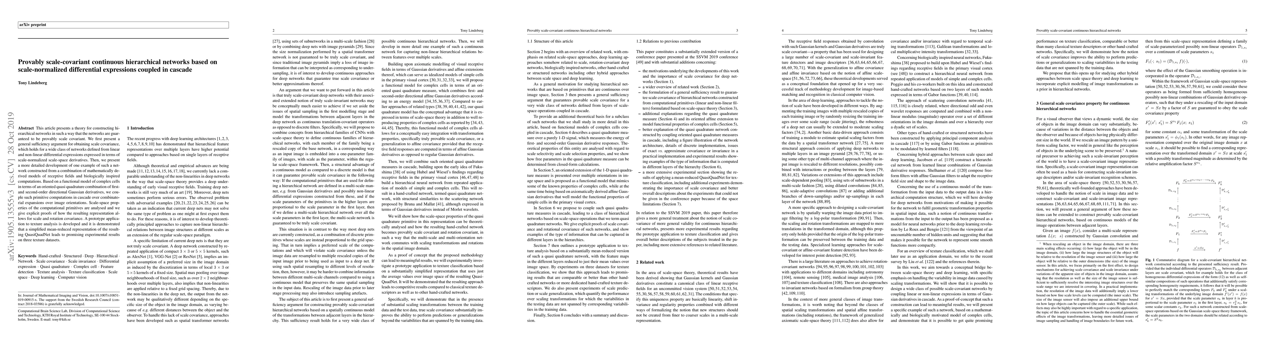 This article presents a theory for constructing hierarchical networks in such a way that the networks are guaranteed to be provably scale covariant. We first present a general sufficiency argument for obtaining scale covariance, which holds for a wide class of networks defined from linear and non-linear differential expressions expressed in terms of scale-normalized scale-space derivatives. Then, we present a more detailed development of one example of such a network constructed from a combination of mathematically derived models of receptive fields and biologically inspired computations. Based on a functional model of complex cells in terms of an oriented quasi quadrature combination of first- and second-order directional Gaussian derivatives, we couple such primitive computations in cascade over combinatorial expansions over image orientations. Scale-space properties of the computational primitives are analysed and we give explicit proofs of how the resulting representation allows for scale and rotation covariance. A prototype application to texture analysis is developed and it is demonstrated that a simplified mean-reduced representation of the resulting QuasiQuadNet leads to promising experimental results on three texture datasets.