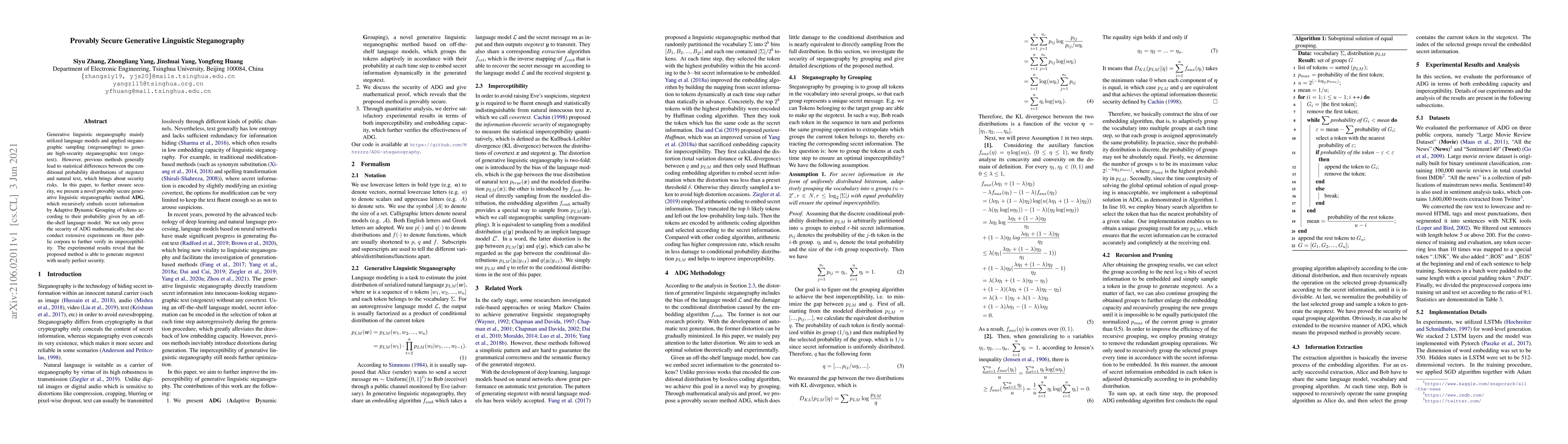 This paper introduces a novel provably secure generative linguistic steganographic method, ADG, which embeds secret information through Adaptive Dynamic Grouping of tokens. The method ensures security by minimizing statistical differences between stegotext and natural text, and it is mathematically proven to be secure with extensive experimental validation on public corpora.