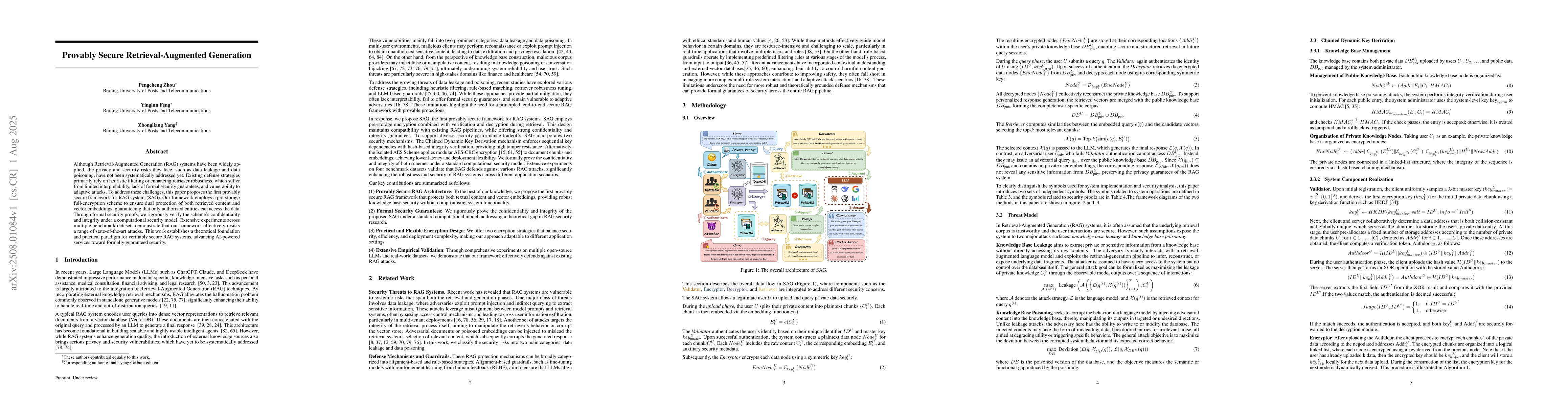 Although Retrieval-Augmented Generation (RAG) systems have been widely applied, the privacy and security risks they face, such as data leakage and data poisoning, have not been systematically addressed yet. Existing defense strategies primarily rely on heuristic filtering or enhancing retriever robustness, which suffer from limited interpretability, lack of formal security guarantees, and vulnerability to adaptive attacks. To address these challenges, this paper proposes the first provably secure framework for RAG systems(SAG). Our framework employs a pre-storage full-encryption scheme to ensure dual protection of both retrieved content and vector embeddings, guaranteeing that only authorized entities can access the data. Through formal security proofs, we rigorously verify the scheme's confidentiality and integrity under a computational security model. Extensive experiments across multiple benchmark datasets demonstrate that our framework effectively resists a range of state-of-the-art attacks. This work establishes a theoretical foundation and practical paradigm for verifiably secure RAG systems, advancing AI-powered services toward formally guaranteed security.