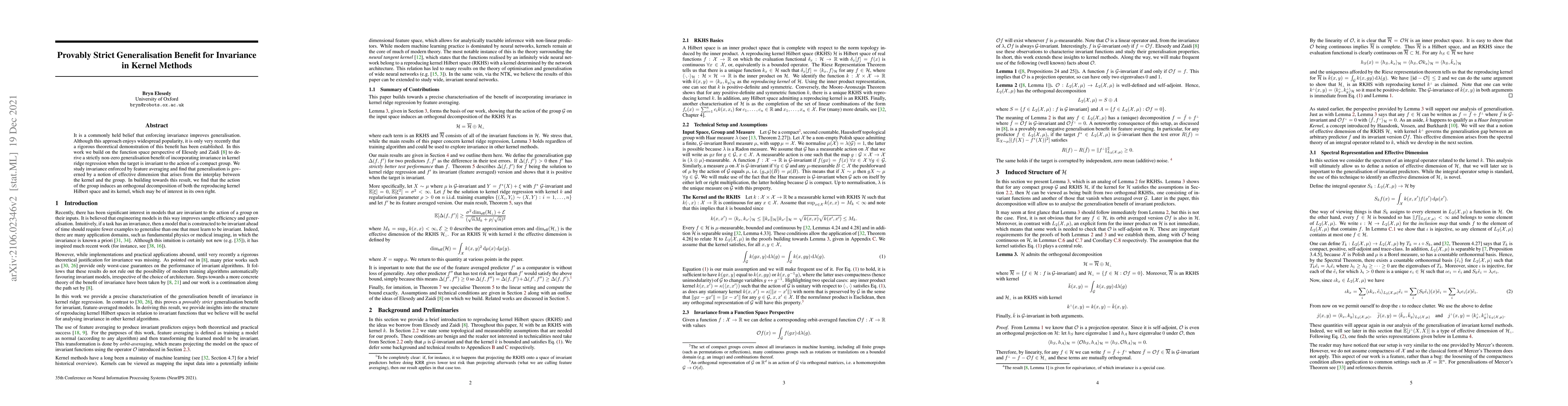 It is a commonly held belief that enforcing invariance improves generalisation. Although this approach enjoys widespread popularity, it is only very recently that a rigorous theoretical demonstration of this benefit has been established. In this work we build on the function space perspective of Elesedy and Zaidi arXiv:2102.10333 to derive a strictly non-zero generalisation benefit of incorporating invariance in kernel ridge regression when the target is invariant to the action of a compact group. We study invariance enforced by feature averaging and find that generalisation is governed by a notion of effective dimension that arises from the interplay between the kernel and the group. In building towards this result, we find that the action of the group induces an orthogonal decomposition of both the reproducing kernel Hilbert space and its kernel, which may be of interest in its own right.