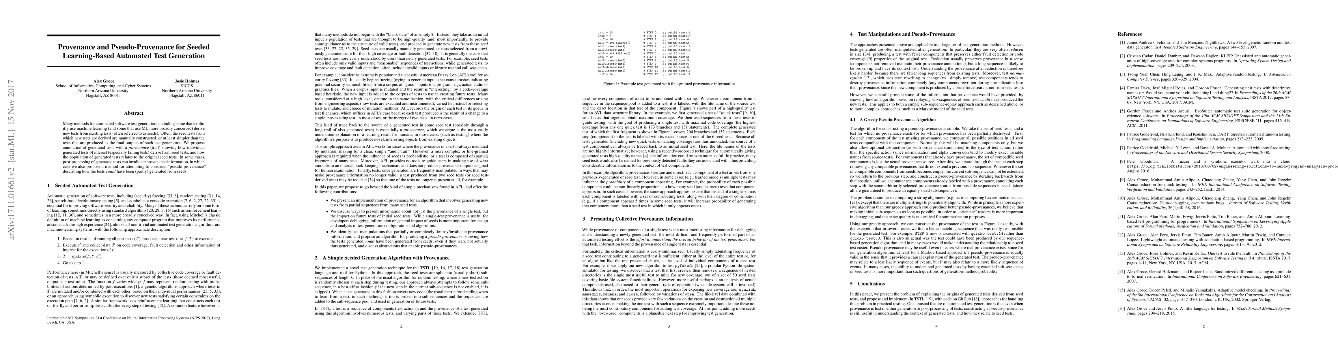 This paper proposes methods to track provenance of machine learning-based automated test generation, including a way to reconstruct pseudo-provenance when original information is lost.