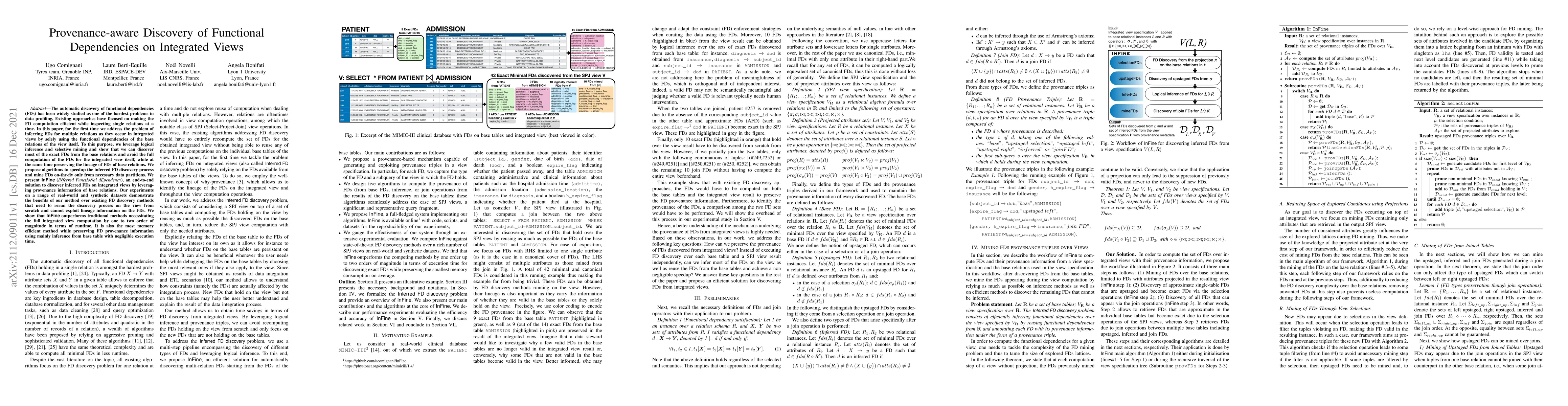 This paper proposes InFine, a novel method for discovering functional dependencies (FDs) in integrated views by leveraging provenance information from the base relations. It efficiently infers FDs without recomputing them from the integrated view, significantly reducing runtime and memory usage compared to traditional methods.