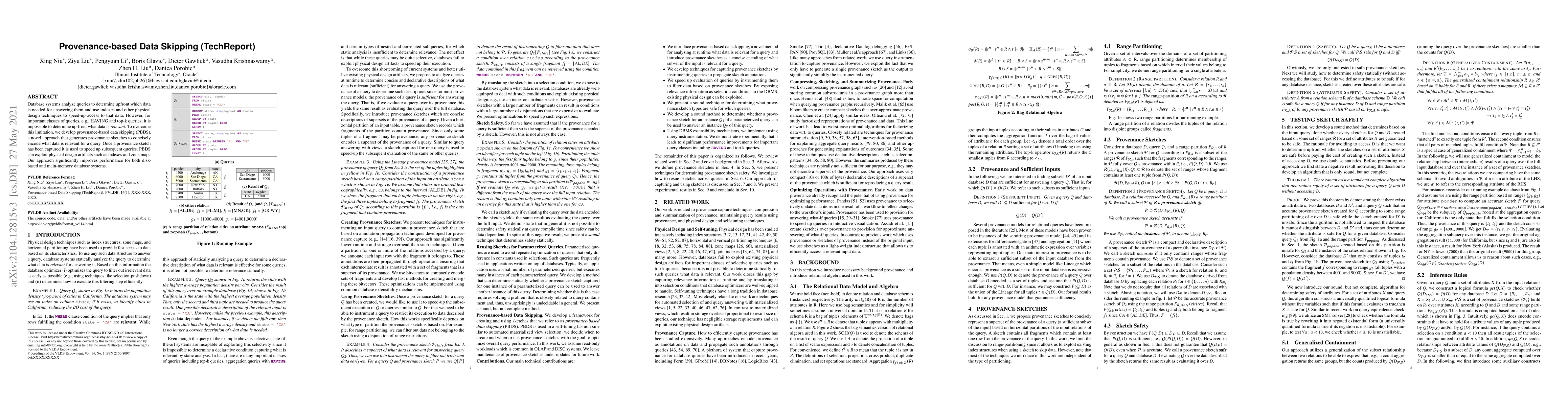 This paper introduces provenance-based data skipping (PBDS), a method that uses provenance sketches to efficiently identify relevant data for complex queries like HAVING and top-k queries. PBDS leverages physical design artifacts to enhance query performance, significantly improving speed in both disk-based and main-memory database systems.