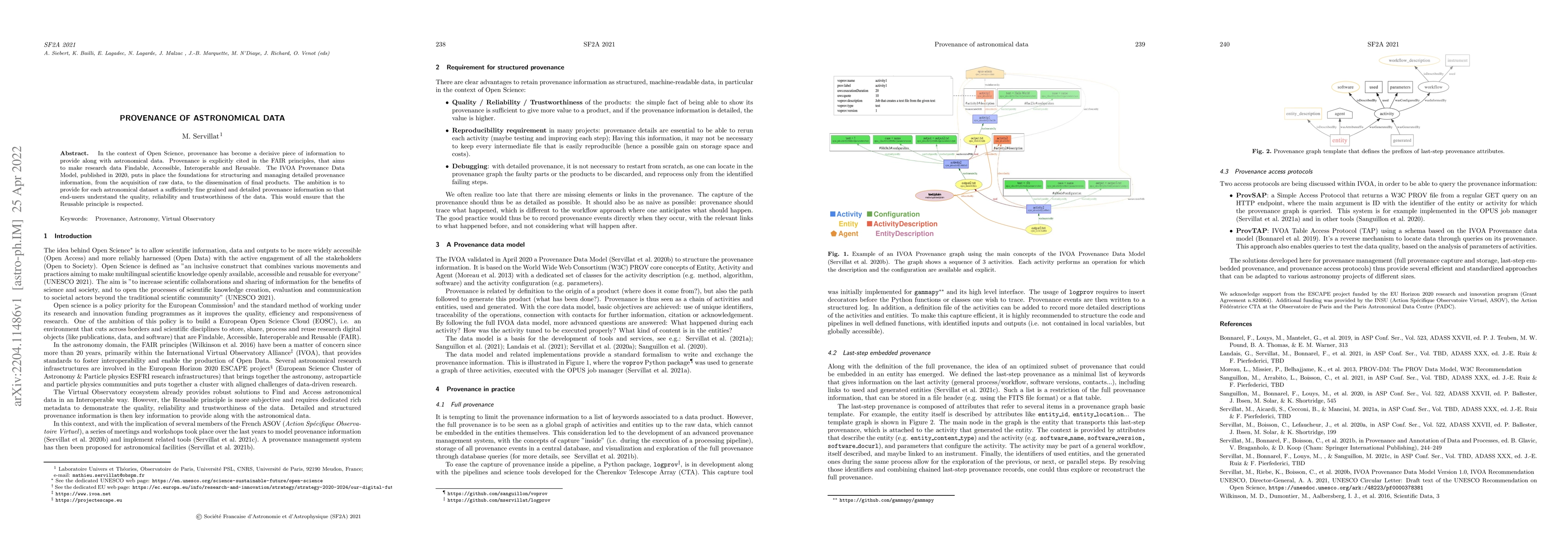 In the context of Open Science, provenance has become a decisive piece of information to provide along with astronomical data. Provenance is explicitly cited in the FAIR principles, that aims to make research data Findable, Accessible, Interoperable and Reusable. The IVOA Provenance Data Model, published in 2020, puts in place the foundations for structuring and managing detailed provenance information, from the acquisition of raw data, to the dissemination of final products. The ambition is to provide for each astronomical dataset a sufficiently fine grained and detailed provenance information so that end-users understand the quality, reliability and trustworthiness of the data. This would ensure that the Reusable principle is respected.