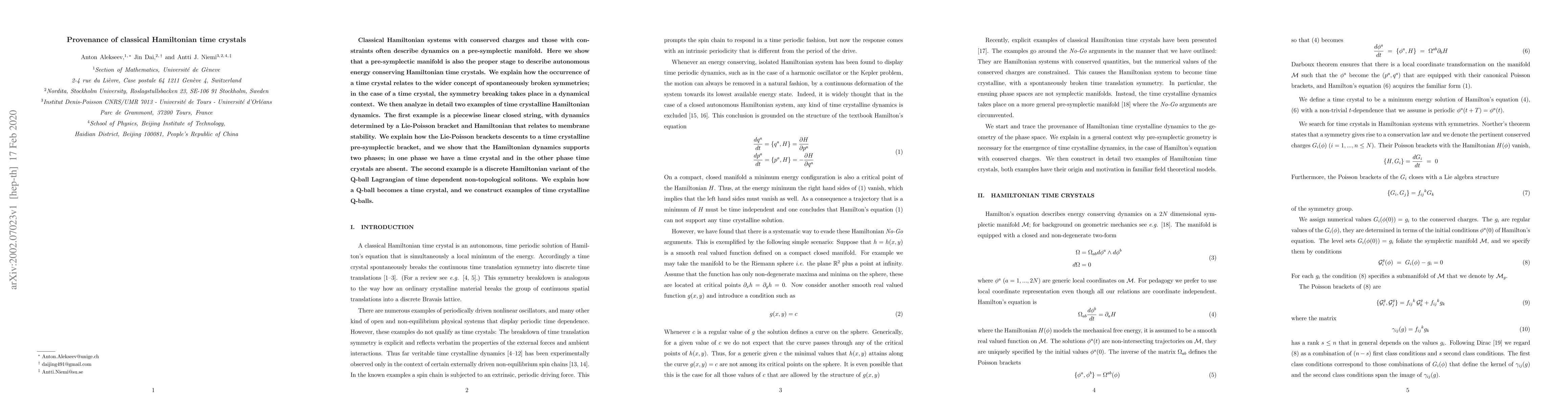 Classical Hamiltonian systems with conserved charges and those with constraints often describe dynamics on a pre-symplectic manifold. Here we show that a pre-symplectic manifold is also the proper stage to describe autonomous energy conserving Hamiltonian time crystals. We explain how the occurrence of a time crystal relates to the wider concept of spontaneously broken symmetries; in the case of a time crystal, the symmetry breaking takes place in a dynamical context. We then analyze in detail two examples of time crystalline Hamiltonian dynamics. The first example is a piecewise linear closed string, with dynamics determined by a Lie-Poisson bracket and Hamiltonian that relates to membrane stability. We explain how the Lie-Poisson brackets descents to a time crystalline pre-symplectic bracket, and we show that the Hamiltonian dynamics supports two phases; in one phase we have a time crystal and in the other phase time crystals are absent. The second example is a discrete Hamiltonian variant of the Q-ball Lagrangian of time dependent non-topological solitons. We explain how a Q-ball becomes a time crystal, and we construct examples of time crystalline Q-balls.