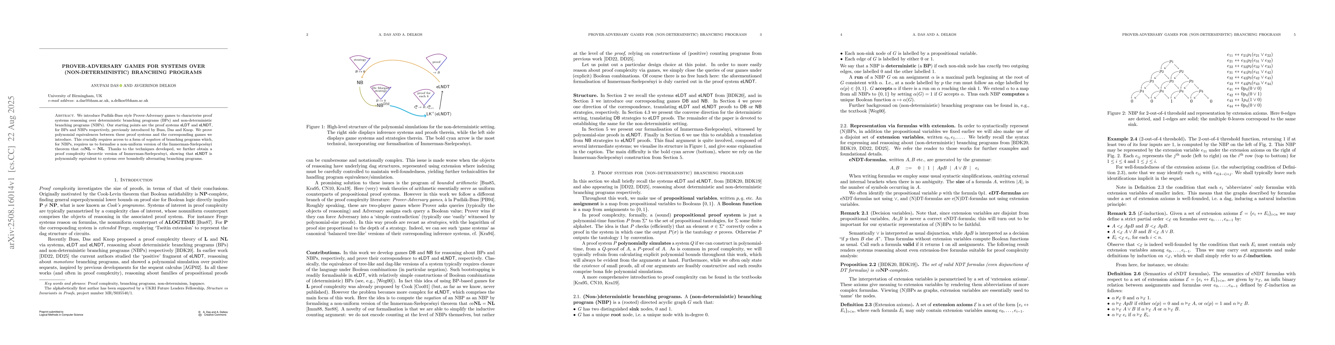 We introduce Pudlak-Buss style Prover-Adversary games to characterise proof systems reasoning over deterministic branching programs (BPs) and non-deterministic branching programs (NBPs). Our starting points are the proof systems eLDT and eLNDT, for BPs and NBPs respectively, previously introduced by Buss, Das and Knop. We prove polynomial equivalences between these proof systems and the corresponding games we introduce. This crucially requires access to a form of negation of branching programs which, for NBPs, requires us to formalise a non-uniform version of the Immerman-Szelepcsenyi theorem that coNL = NL. Thanks to the techniques developed, we further obtain a proof complexity theoretic version of Immerman-Szelepcsenyi, showing that eLNDT is polynomially equivalent to systems over boundedly alternating branching programs.